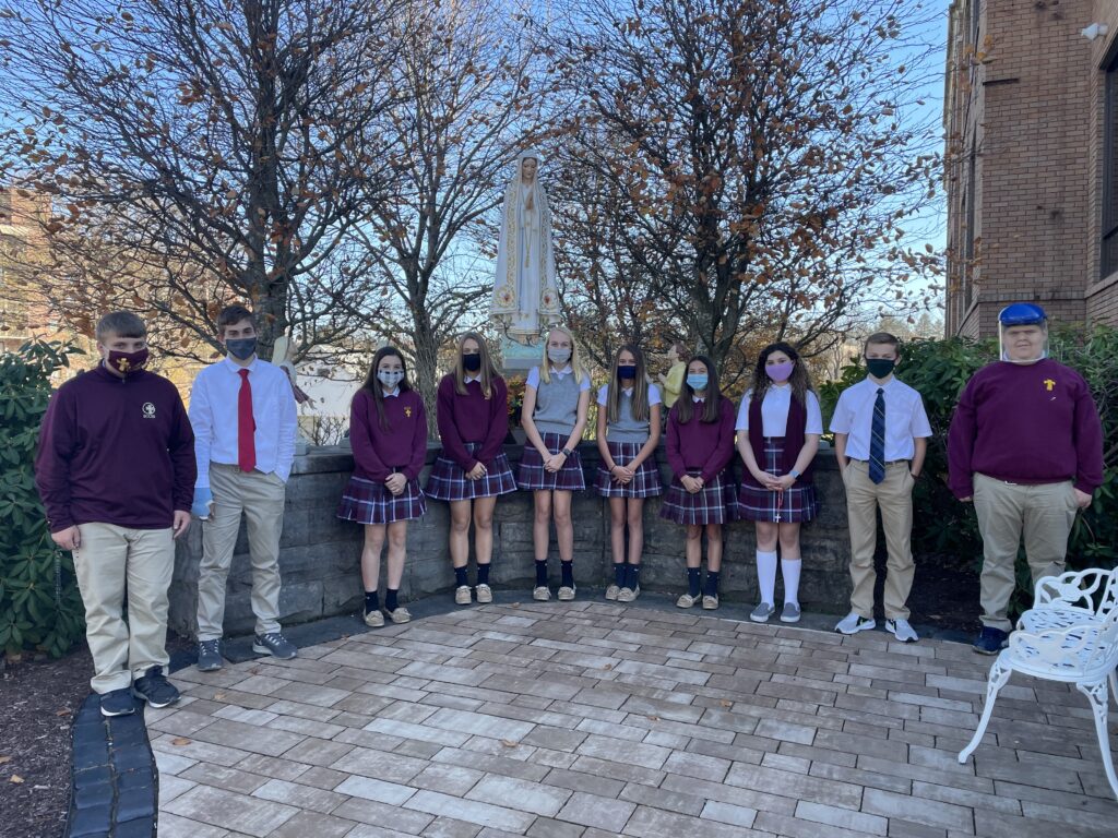 8th grade students from St. Marys Catholic Middle School took a walk to the Fatima Statue on Center St. The students recently watched Fatima in Religion Class. They learned the history of Fatima and discussed the Miracle of the Sun.