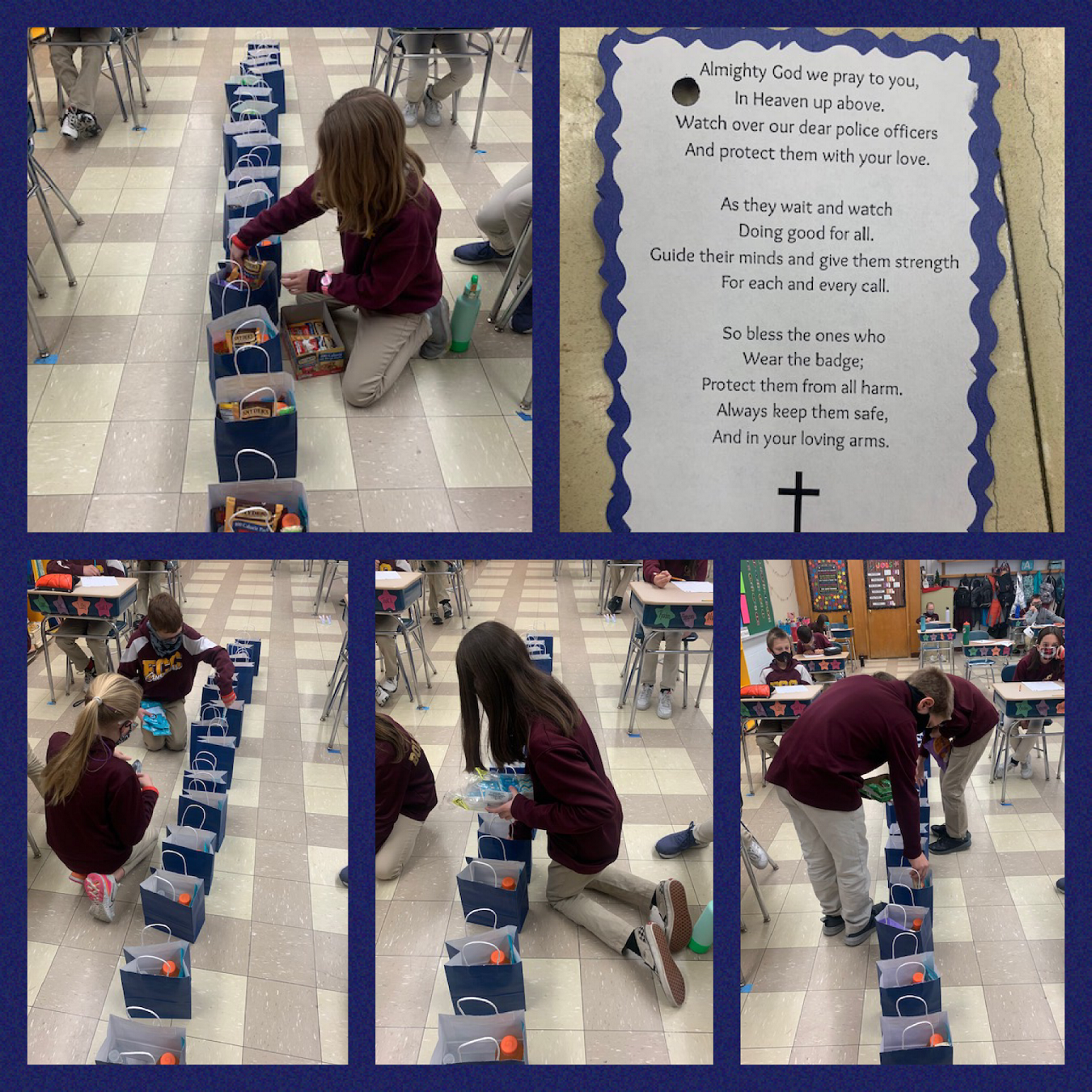 The 5th grade class at St. Mary’s Catholic Elementary School recently made Kruiser Kits for the police officers of St. Marys. The students took up a donation and bought drinks, snacks, chips, cookies, crackers, candy, hand sanitizer, tissues and face masks. One Kruiser Kit for each policeman was delivered by the teachers.