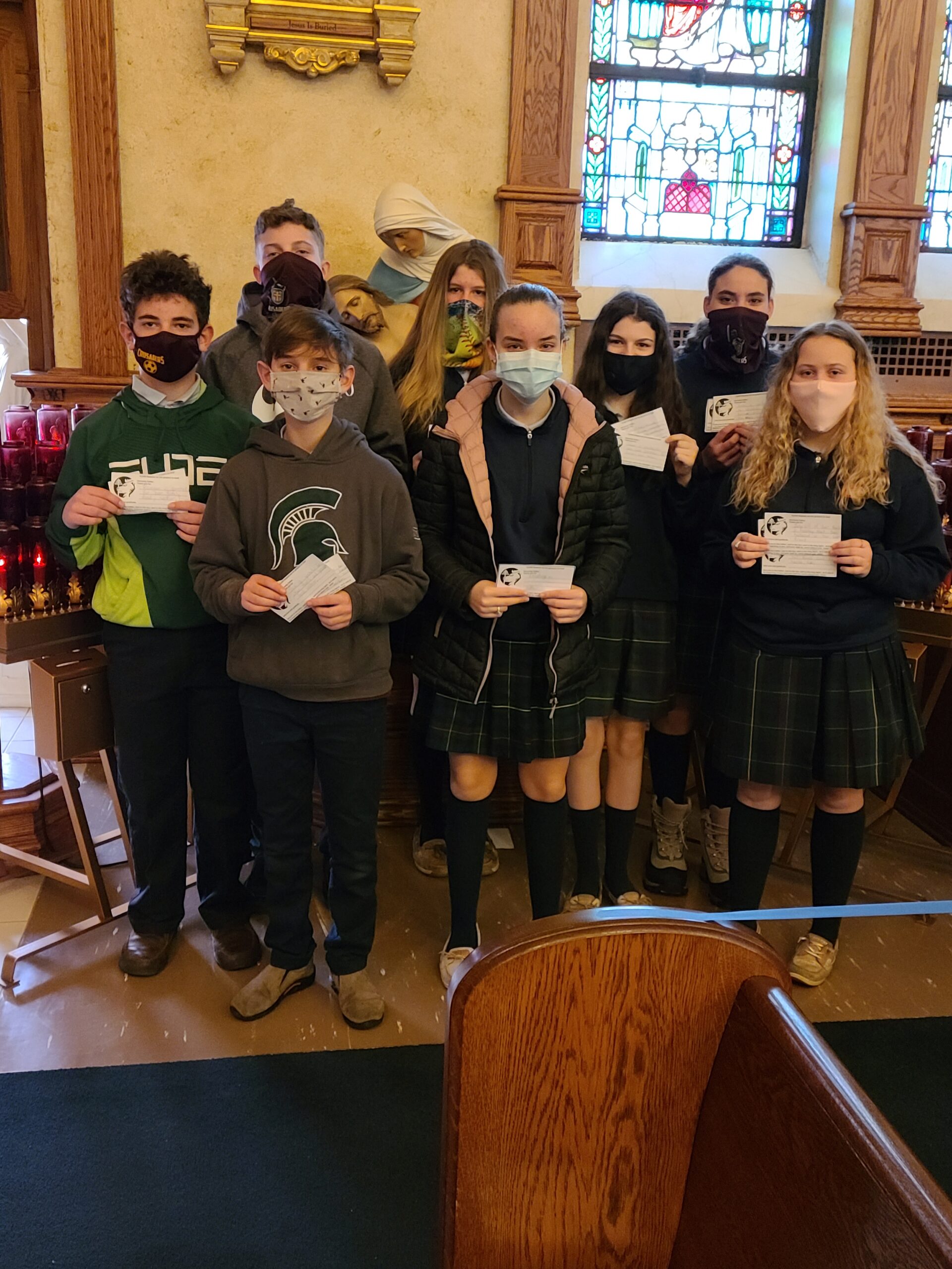 At St. Leo School, the virtues are woven through our daily life. In December, students were encouraged to write prayers of gratitude to God for themselves, their family, and friends and lay them at the foot of the Cross, remembering to see everything as a gift and to be thankful. Pictured are the 8th grade students with their written prayers after attending their weekly Mass.