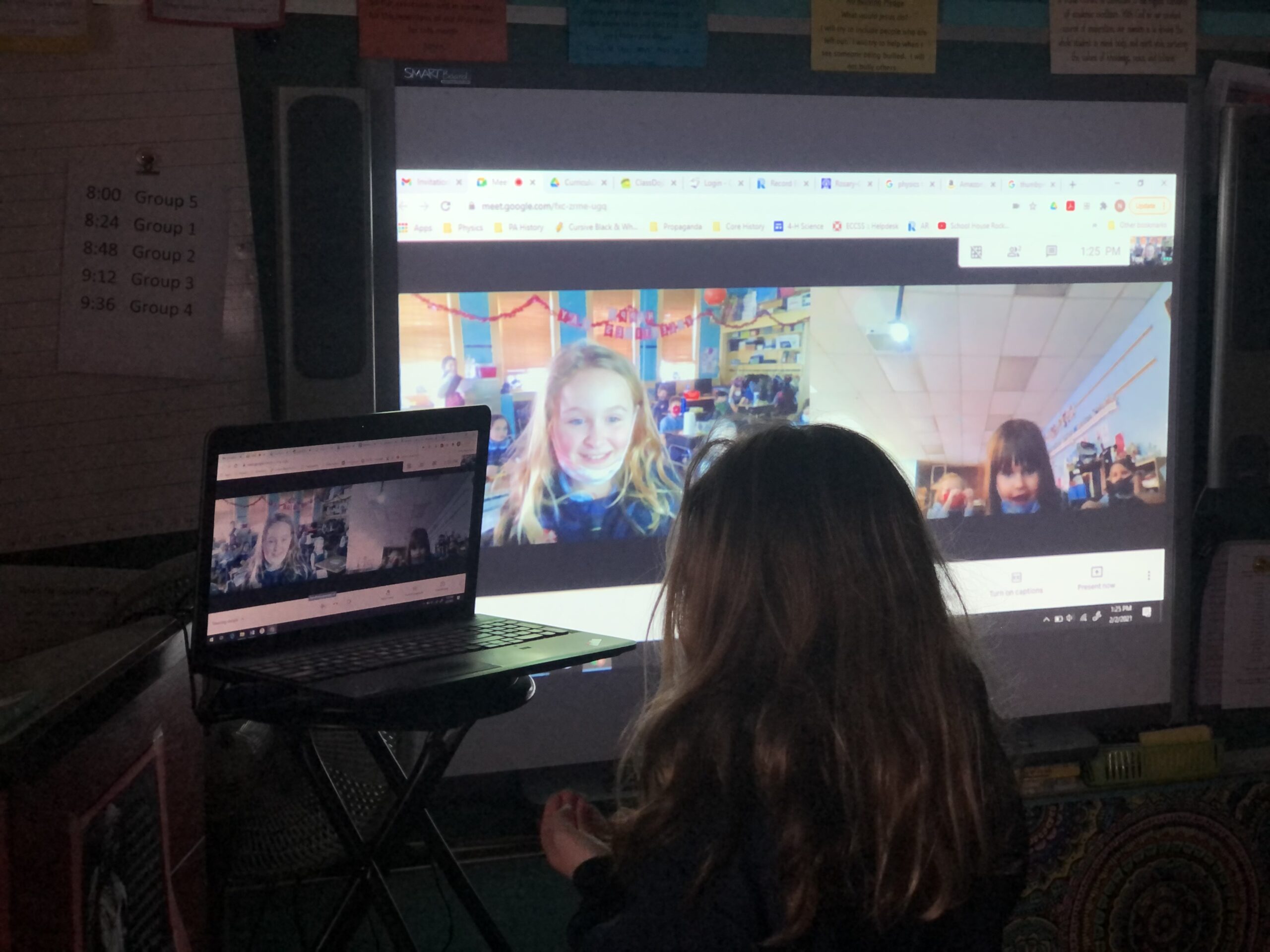 Pictured is Anne Gausman talking to her prayer buddy Lily Kerr. 4th graders met virtually with their prayer buddies to pray the rosary and then got to wish each other a happy Catholic Schools week.