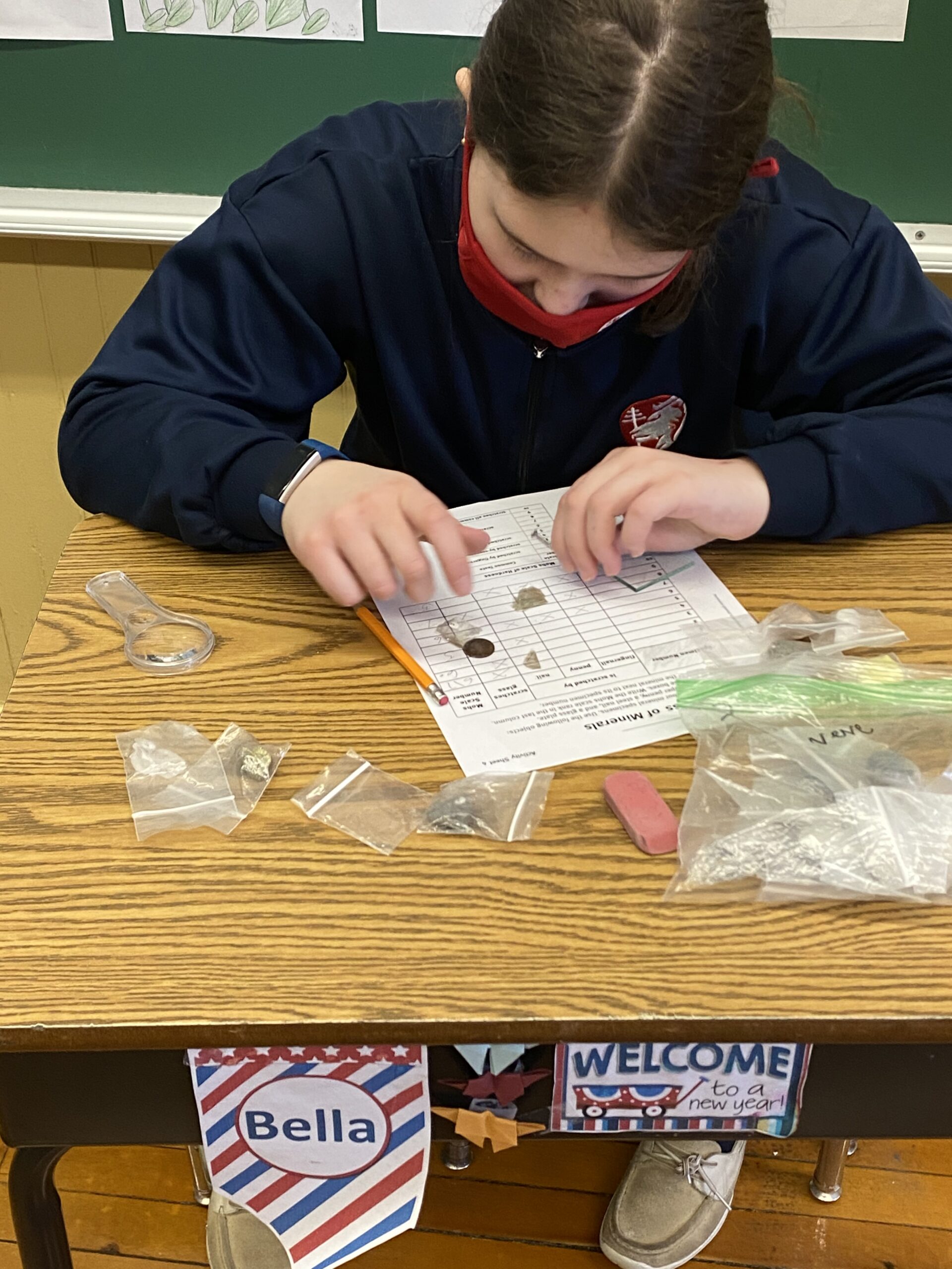 St. Leo School 6th grader Neve Washburn is using the Moh’s Hardness Scale to test the hardness of minerals. The scale totes 10 degrees of hardness, from talc to diamond!