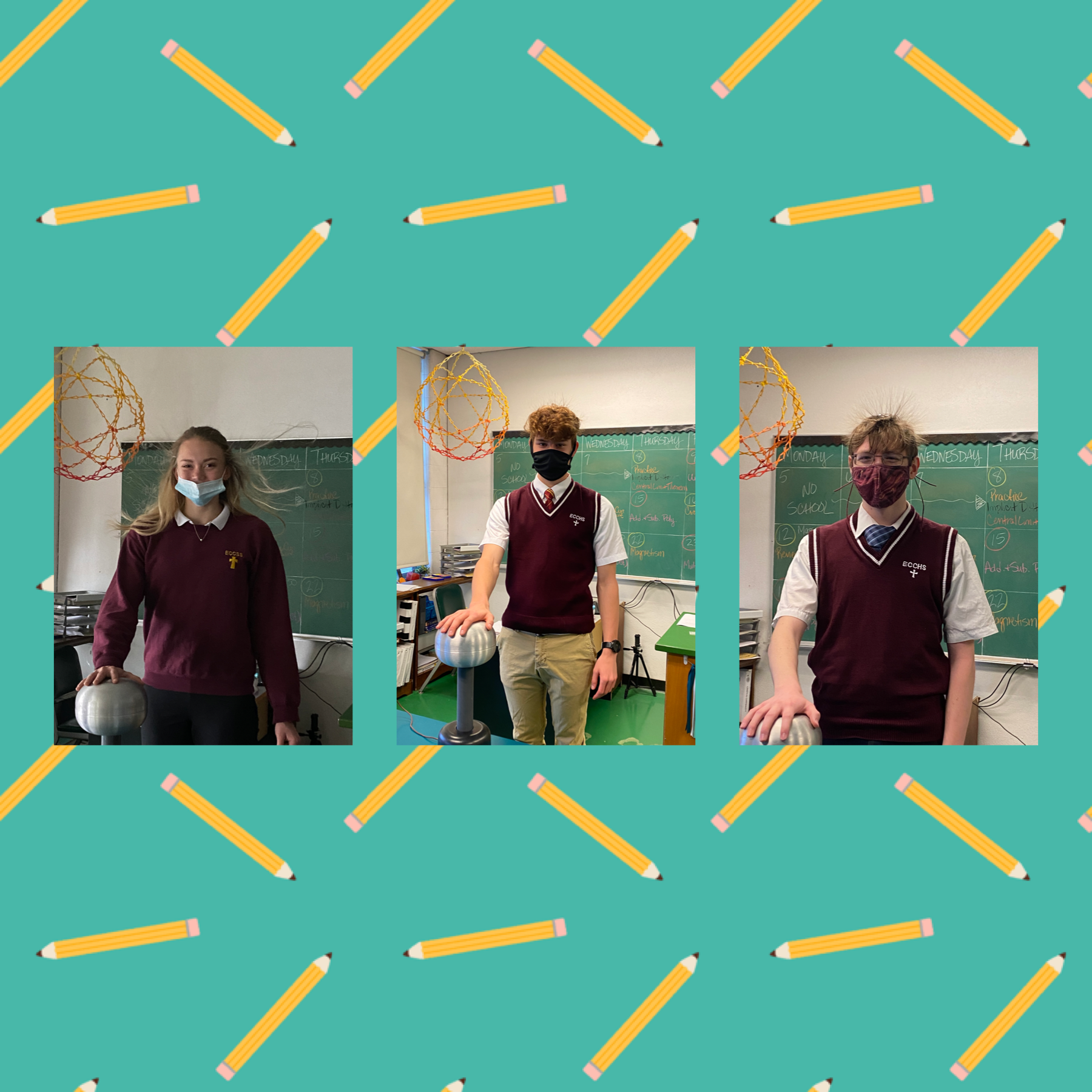 Mrs. Sherry’s Physics II class at Elk County Catholic High School experimented with a Van de Graaf Generator to explore concepts of static electricity and electrical fields. Pictured are Seniors: Kara VanEerden, Joe Wolfe, and Jared Smithbauer doing their “hair-raising” demos!