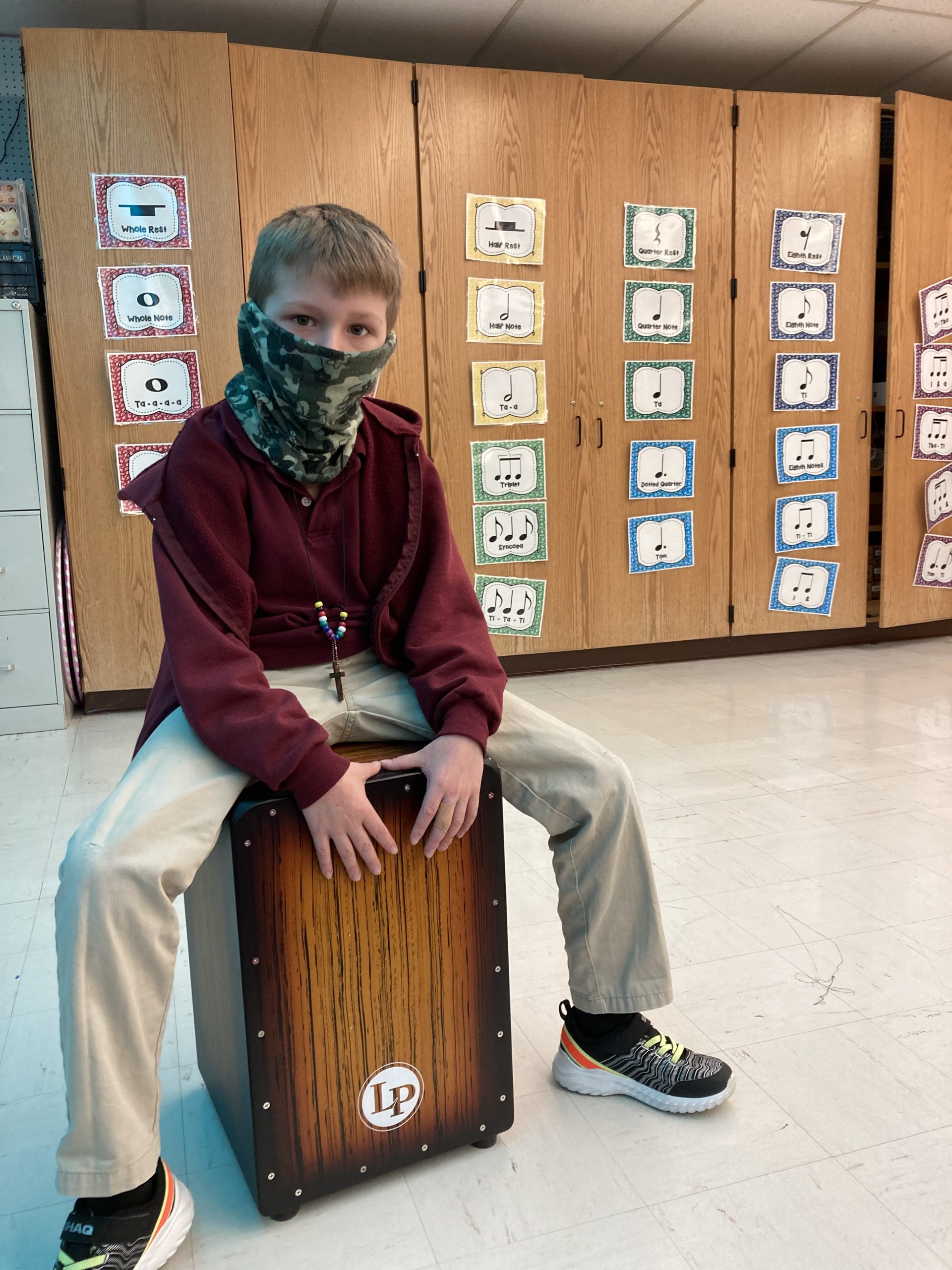 Second grade student Chance Bauer is shown improvising rhythms on the cajon at St. Marys Catholic Elementary School under the direction of music teacher Mrs. Alyssa Wendel. A cajón is a box-shaped percussion instrument originally from Peru, played by slapping the front or rear faces with the hands, fingers, or sometimes implements such as brushes, mallets, or sticks.
