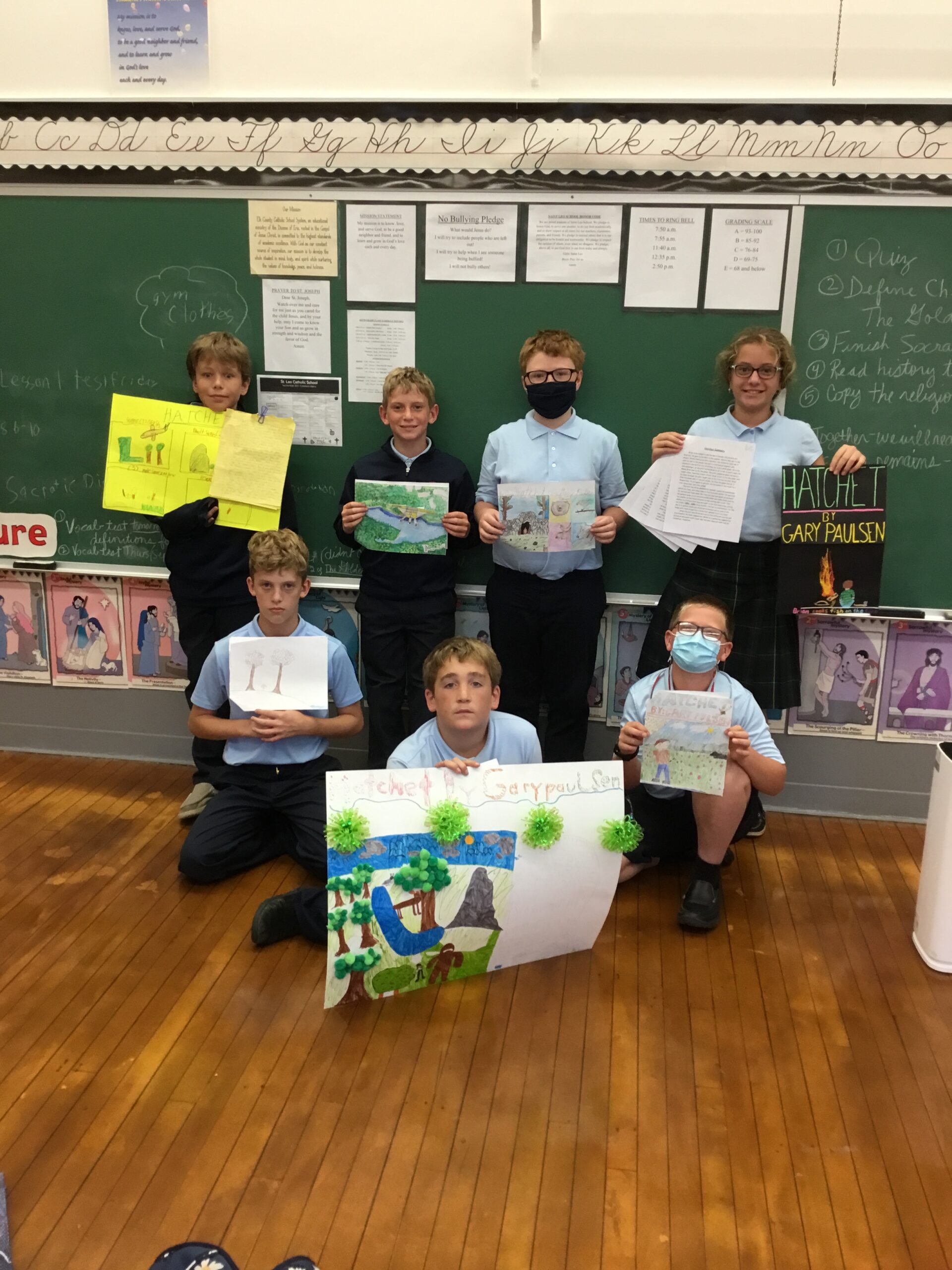 During summer vacation, students in 6th grade at St. Leo Catholic School read Hatchet by Gary Paulsen. Each student wrote a summary of the novel & created a poster depicting events from the story.