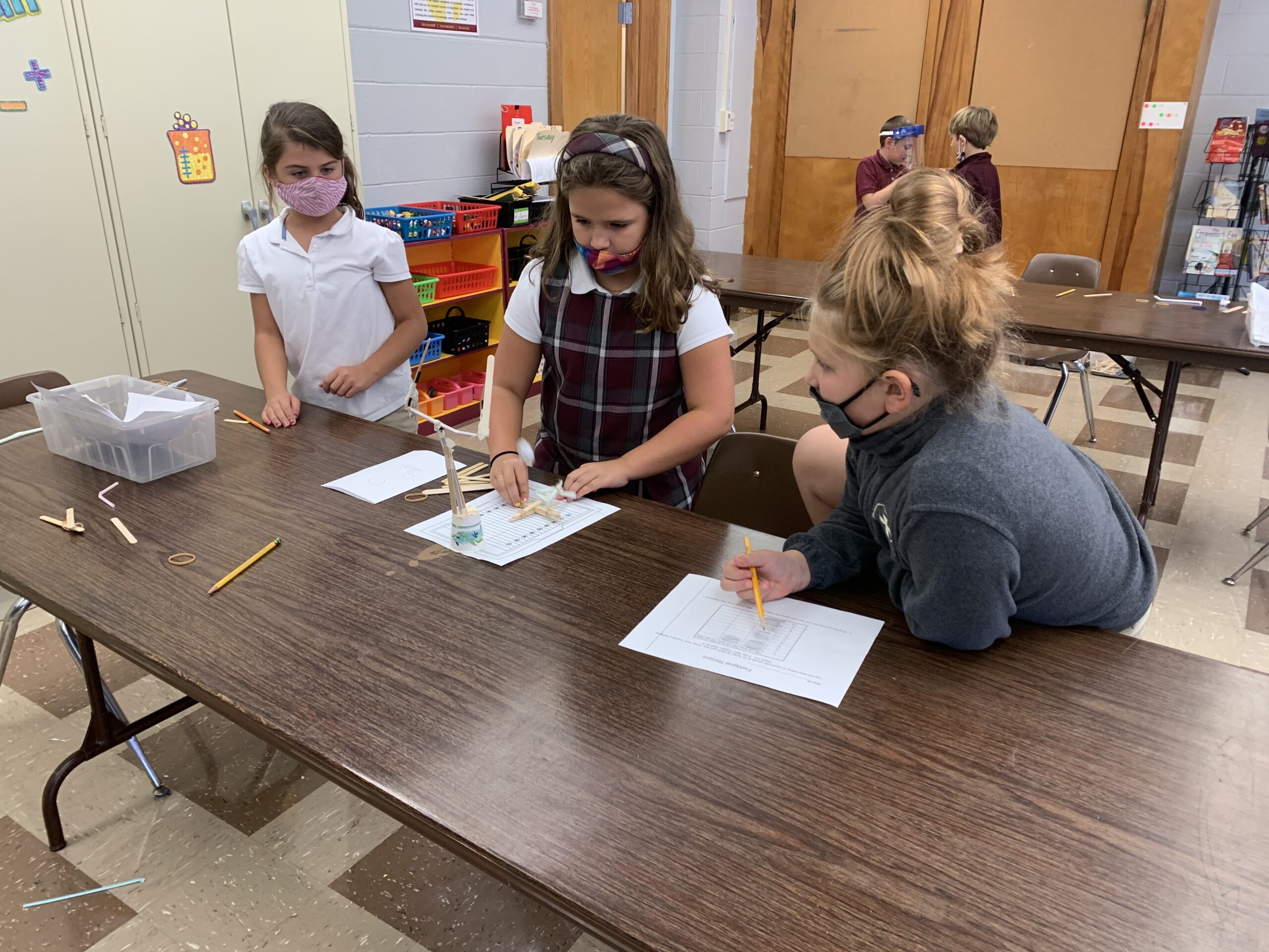 St. Marys Catholic Elementary third grade students Ava, Betsy, and Maddie are shown recording the results of their field goal launchers at the 30, 50, & 70 yard lines during their STREAM (Science, Technology, Religion, Engineering, Art, & Math) project.