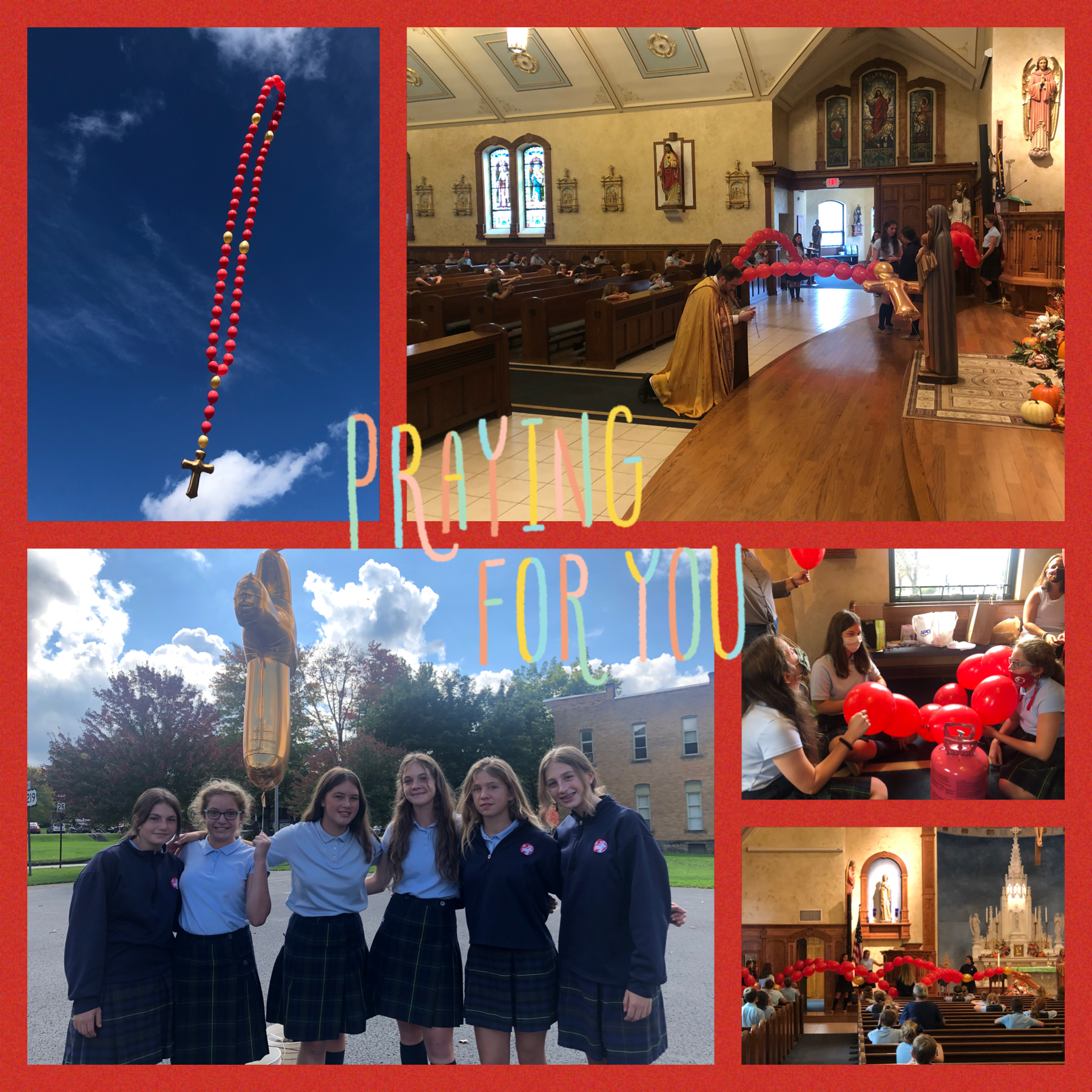 This has become an annual event that is planned by girls in grades 6-8. The students involved have spent weeks preparing the Floating Rosary Project, and started by filling the beads of the balloon rosary with special intention prayers from each SLS student. After the Rosary was constructed, the school community gathered in the church to pray the Rosary together before heading outside to launch it into the sky, lifting over 100 prayers to heaven!