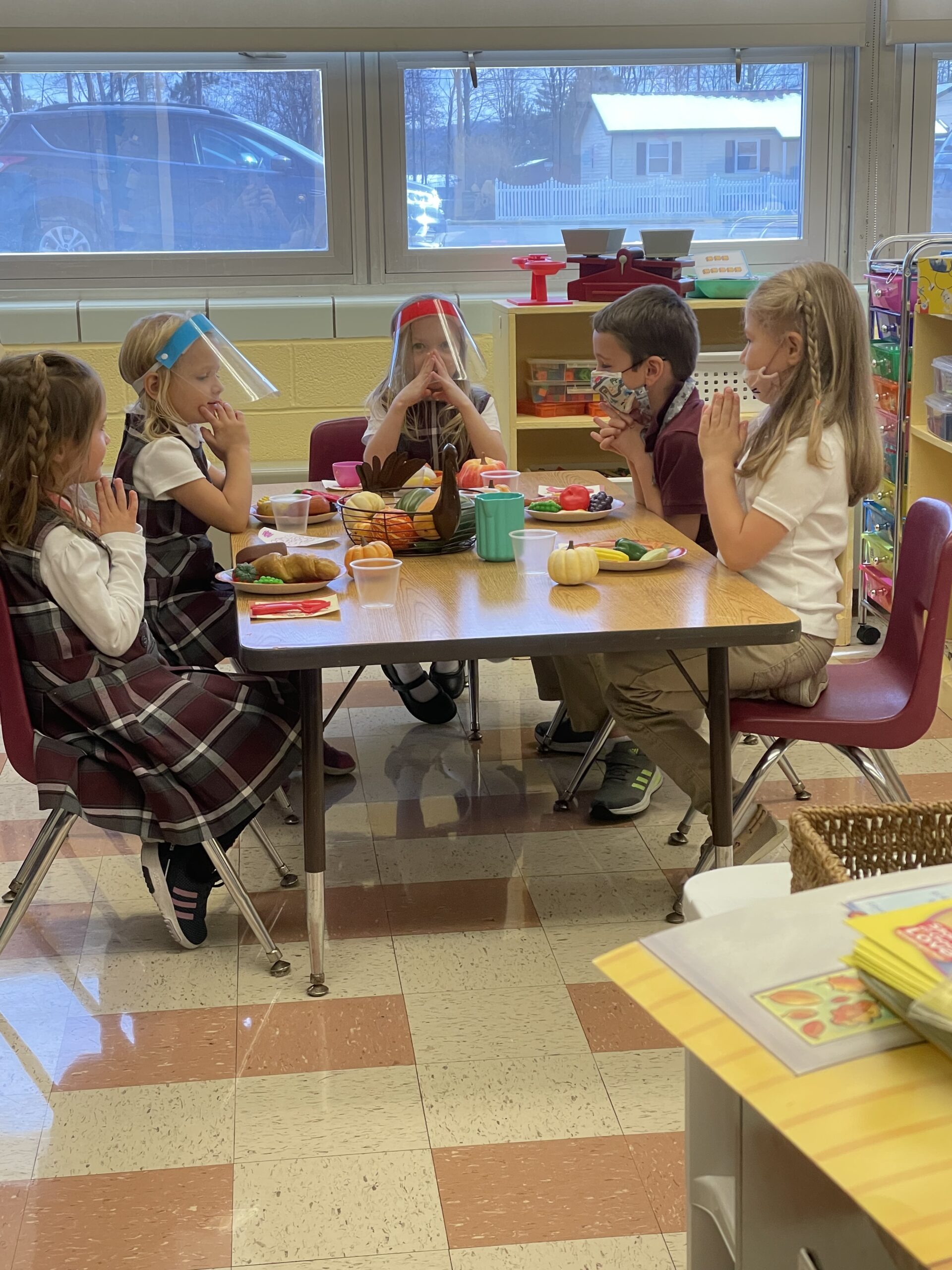 Several students in Mrs. Roberts’ Kindergarten class at St. Marys Catholic Elementary School were recently playing “Thanksgiving” during playtime. They set the table, decided on what foods to serve, and then sat down to enjoy their feast. Before they ate, one child was heard saying, “guys, we need to pray first” so they all prayed the Grace Before Meals.
