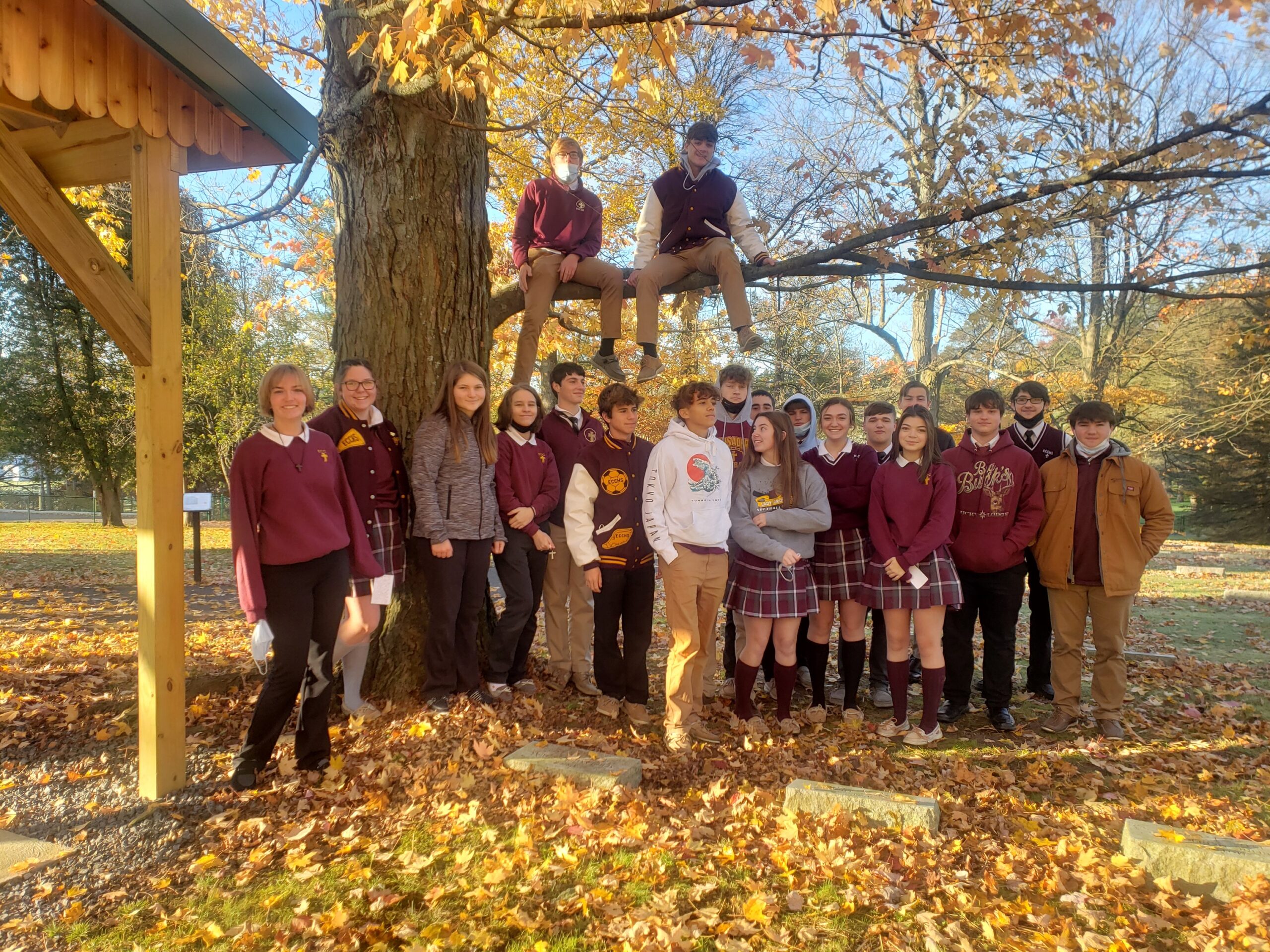 This week, Mrs. Messineo’s English classes made their way over to the beautiful cemetery behind St. Marys Parish Center. Once there, the students recited The Saint Gertrude Prayer releasing 5,800 souls from purgatory. These students would like to encourage everyone to visit a cemetery this month and pray to Saint Gertrude.