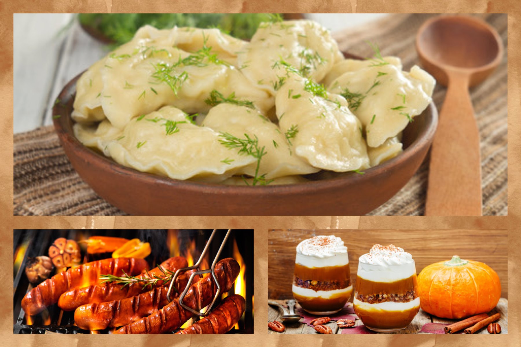 Handmade Pierogi served over Haluski with Polish Kielbasa, and a Cucumber Side Salad.