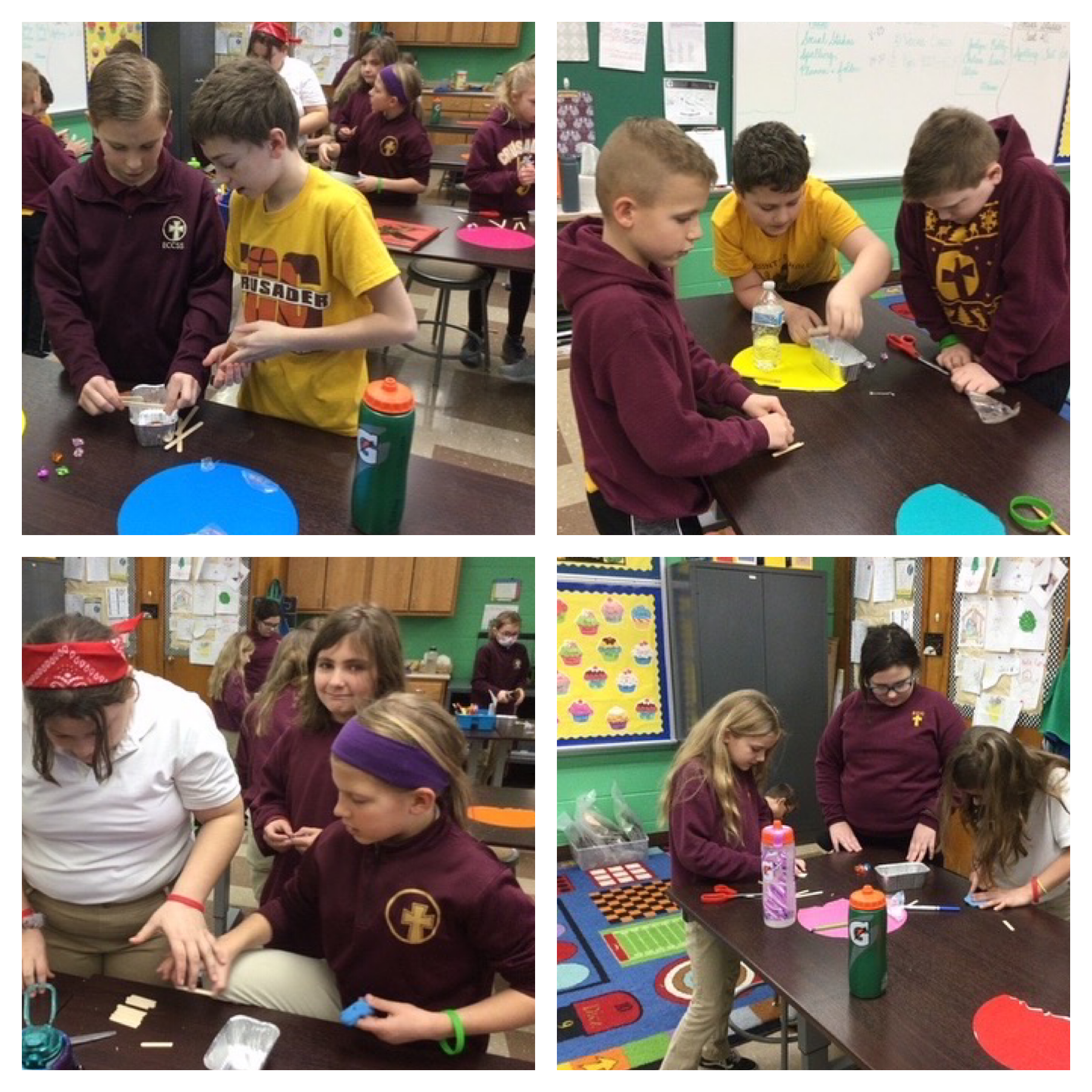The fourth grade students at Saint Marys Catholic Elementary School recently partnered with Natalie Aiello of the 4-H Science Program. The classes took part in a virtual lesson on beavers with a hands-on lab to follow. The object of the lab was to build a dam that didn’t leak using popsicle sticks, rocks, clay, and small bread tins. These students are working together to engineer a dam that holds water.