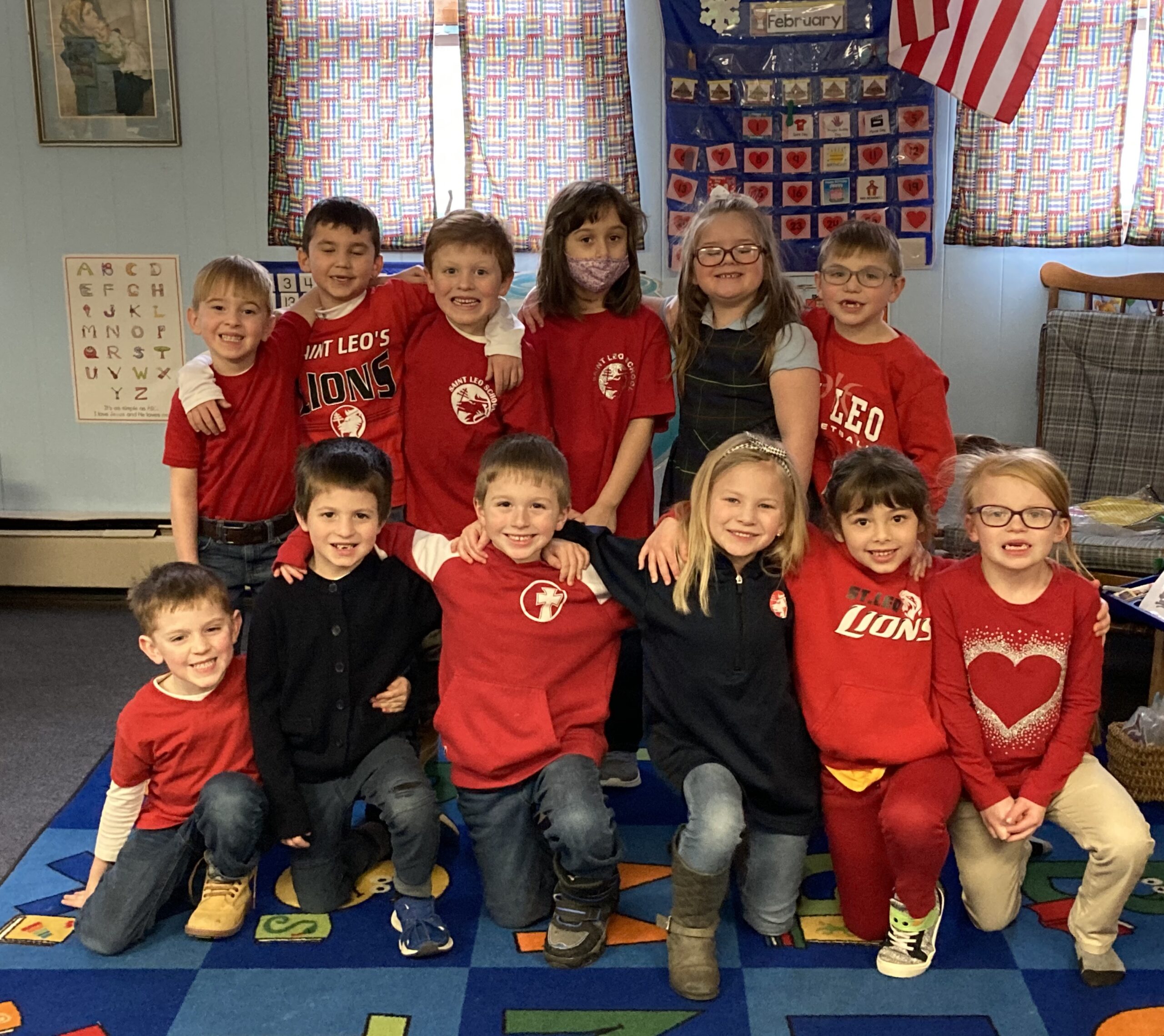 As part of the week long Catholic Schools Week celebration, students donned their school colors of red and white for a Spirit Dress Day. Pictured is St. Leo School’s kindergarten class!