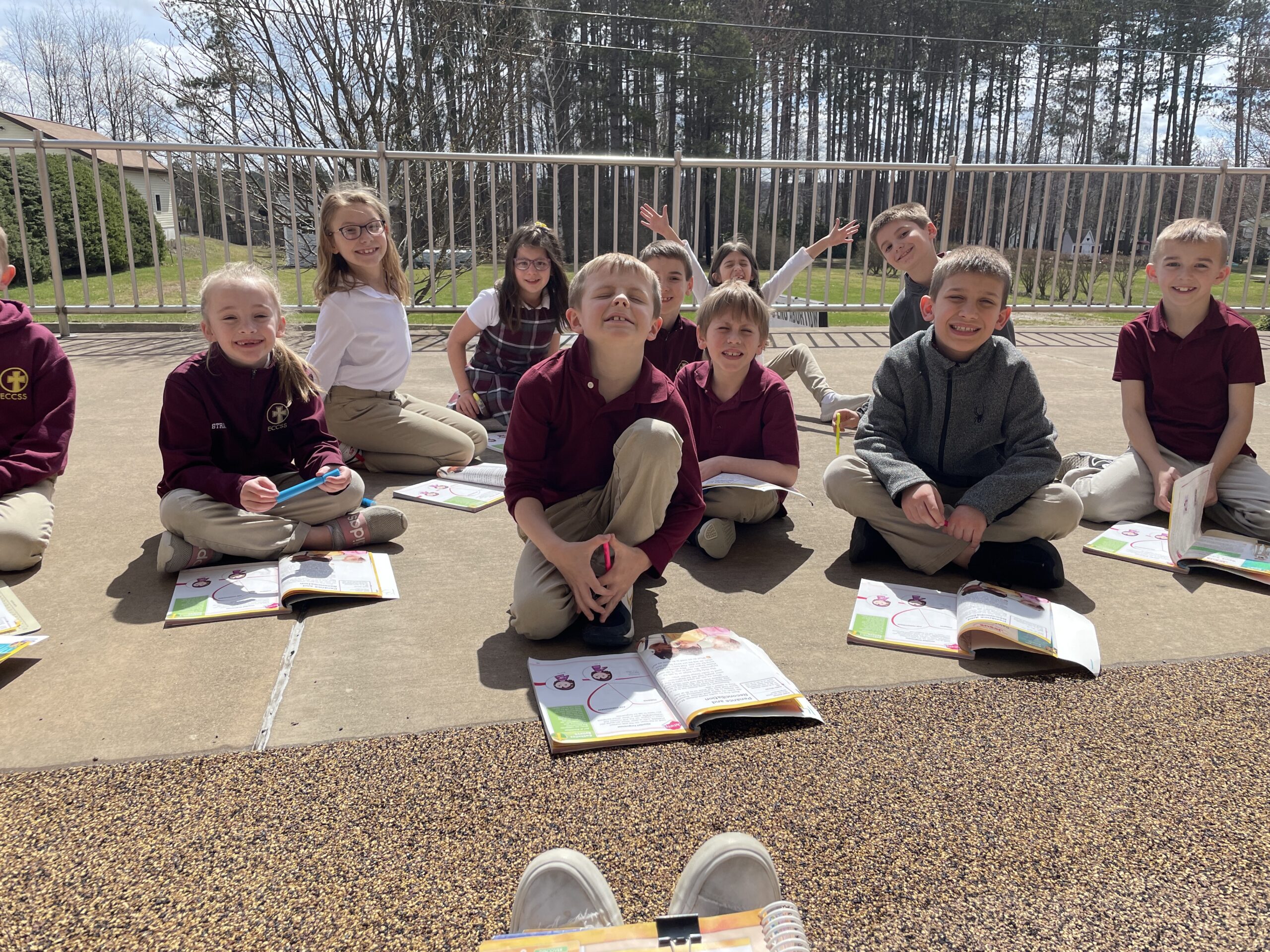 Today second graders at St. Marys Catholic Elementary School are enjoying the mild temperatures and sunshine while holding their religion class outside.