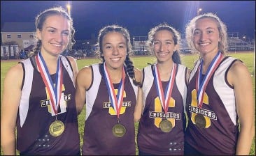 The Lady Crusader 4×800 relay team of Grace Neubert, Sami Straub, Gianna Bille, and Sophia Bille won the D9-AA title in a time of 9:58.48.
