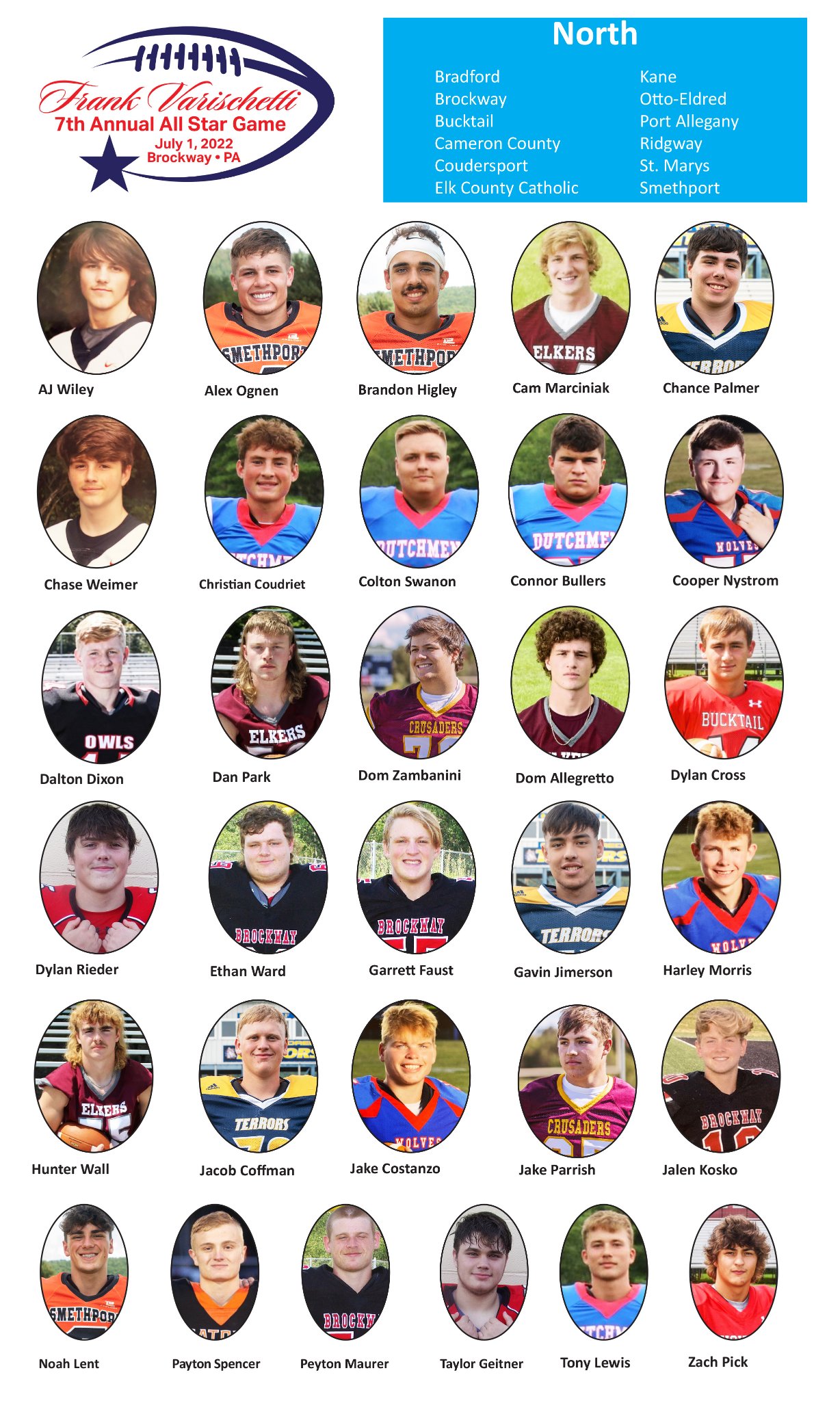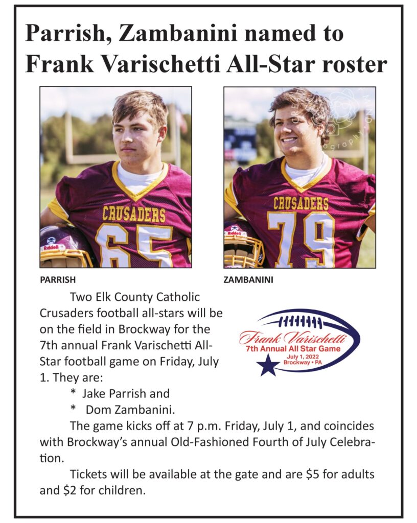 Good luck to 2022 ECCHS graduates Jake Parrish and Dom Zambanini in the 7th Annual Frank Varischetti All Star Football game on Friday, July 1st in Brockway.