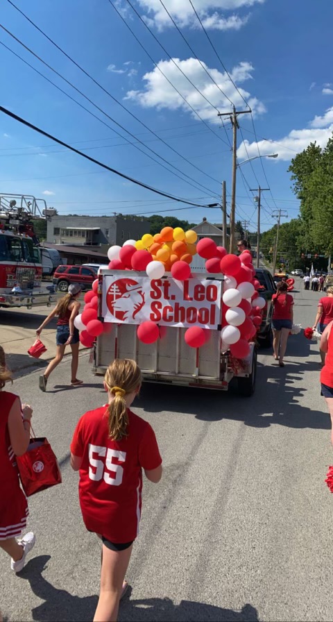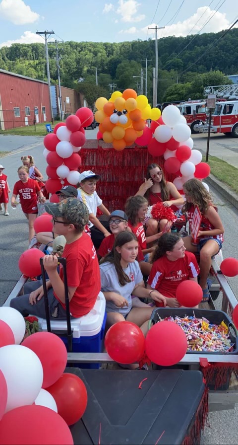 St. Leo families dedicated their time and efforts to decorate a float and walk in the parade to hand out candy while proudly representing St. Leo School. A special thank you to Molly Corl who chaired this event along with Margie Gausman for donating decorations and Hal and Kelly Beimel for the use of their truck and trailer.
