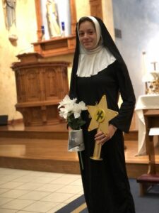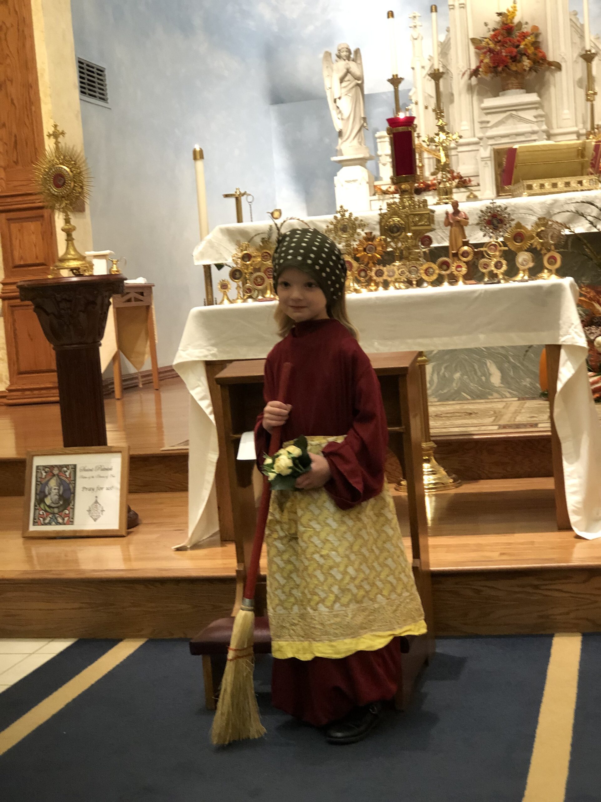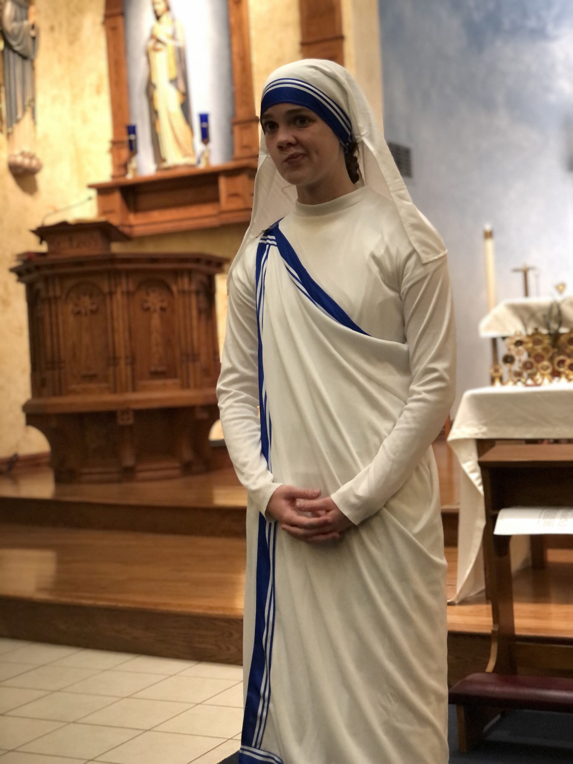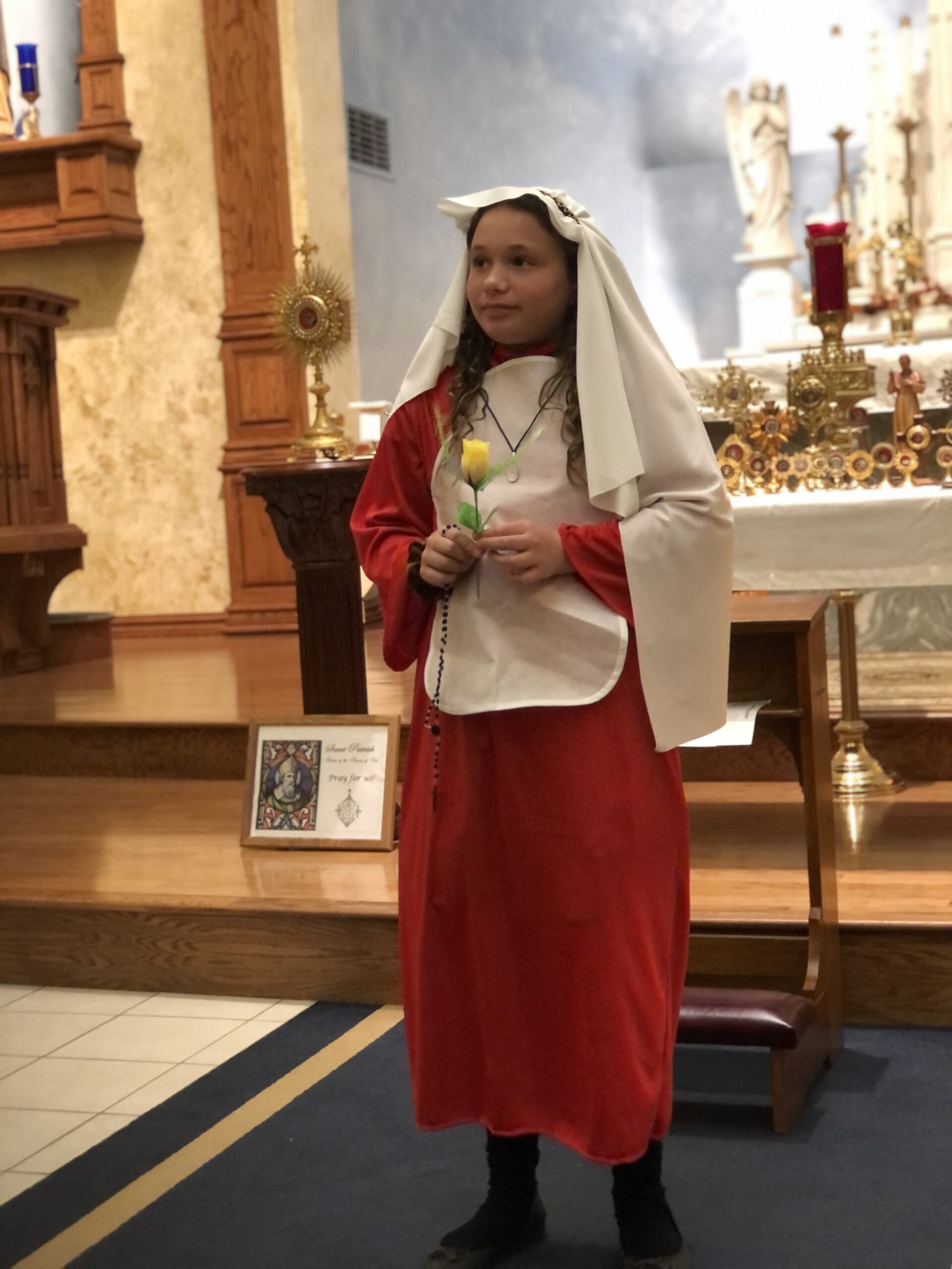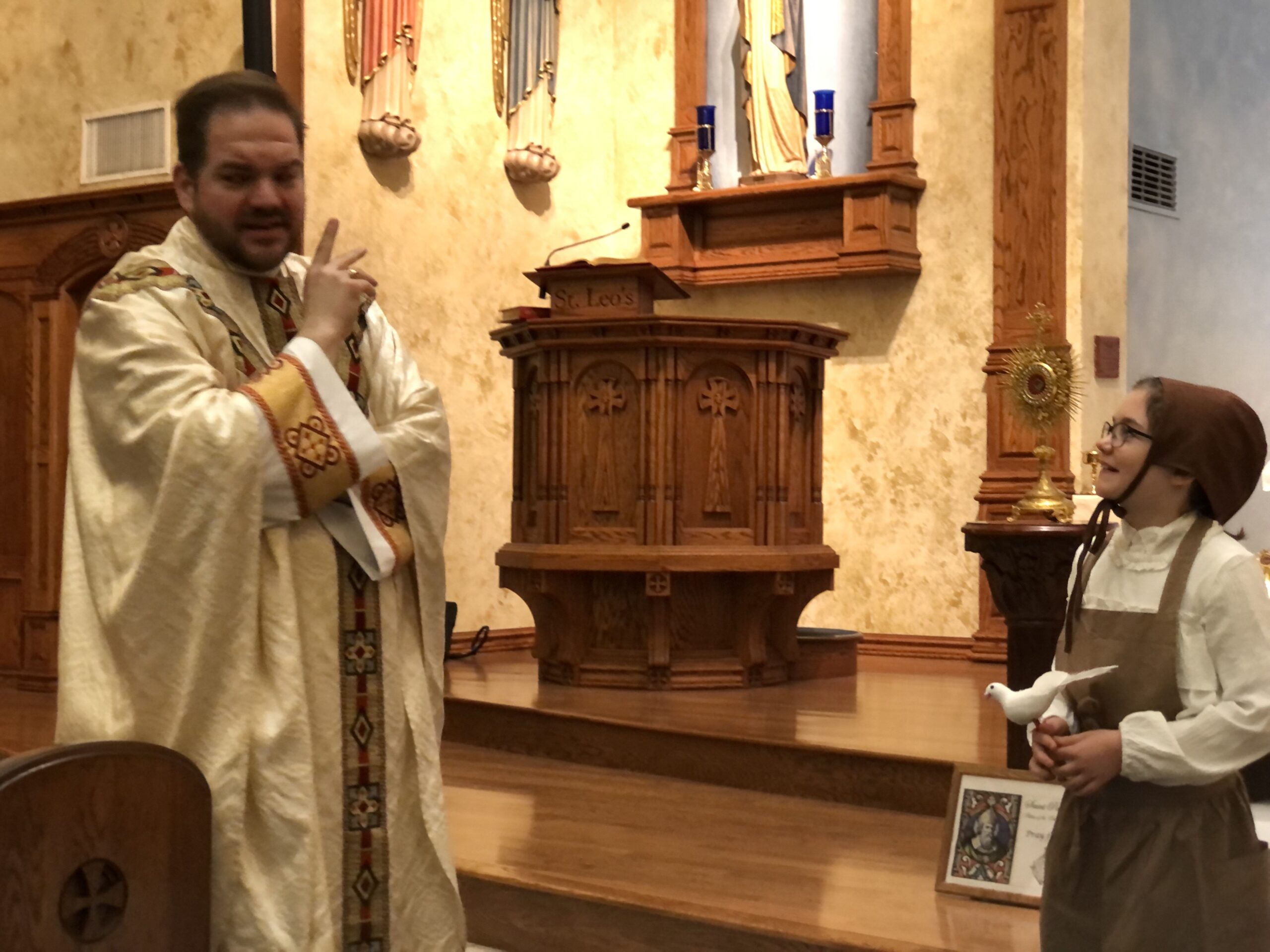 Back row: St. Bernadette, St. Claire of Assisi, St. Teresa of Calcutta, (Fr. Justin), St. Leo
