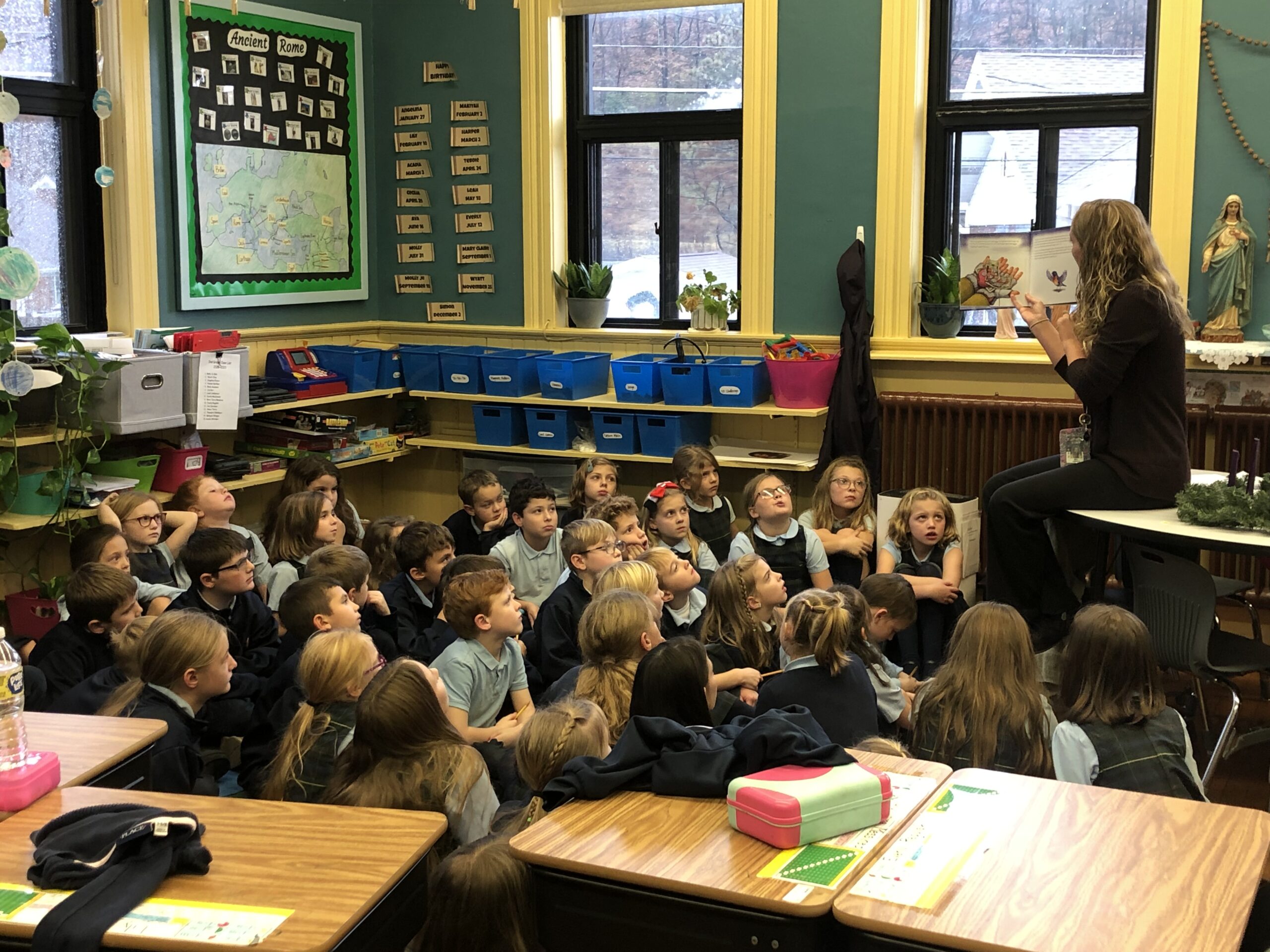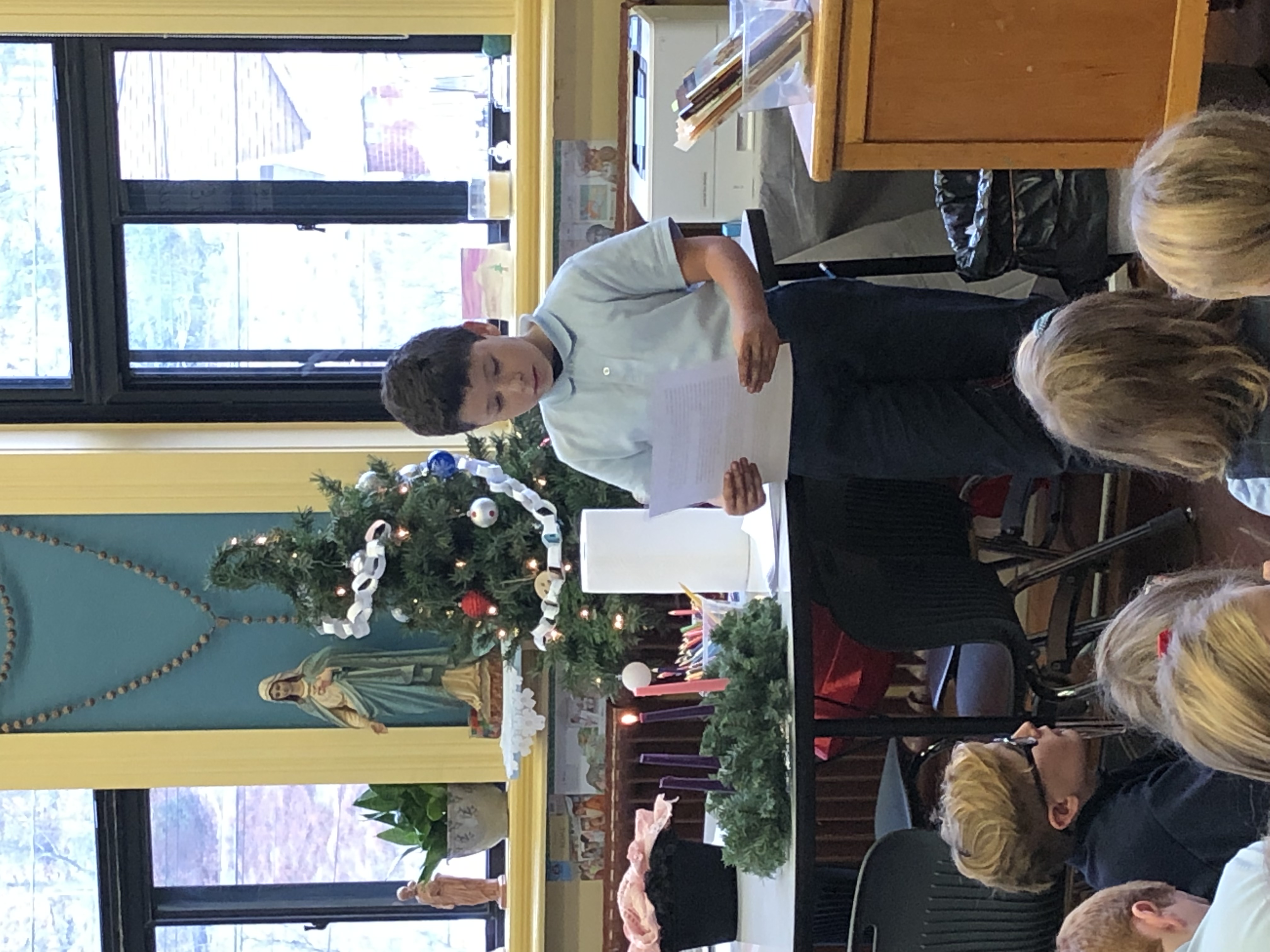 During the season of Advent, students at St. Leo School spiritually prepare for the celebration of the birth of Christ. Pictured is Mrs. Leuschel sharing the story, The Beggar and the Bluebird, and Robert, reading scripture to his peers.