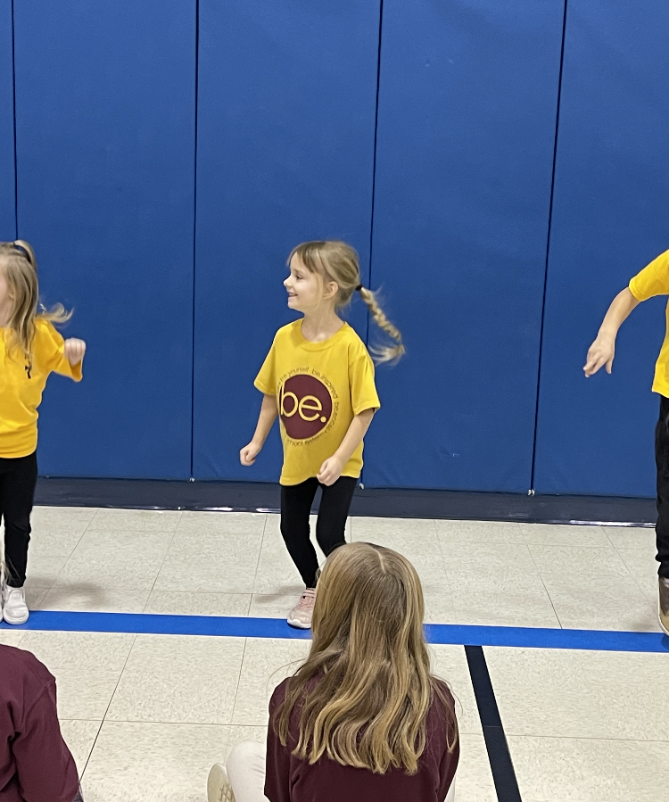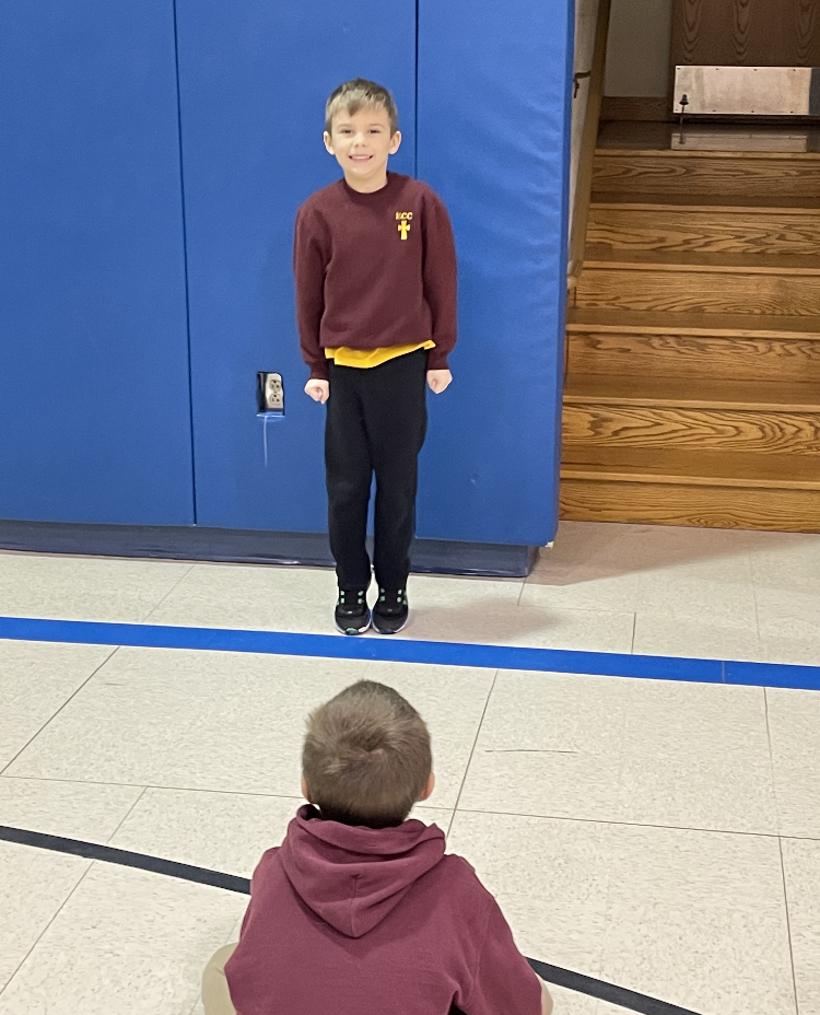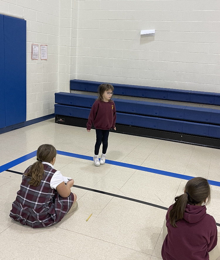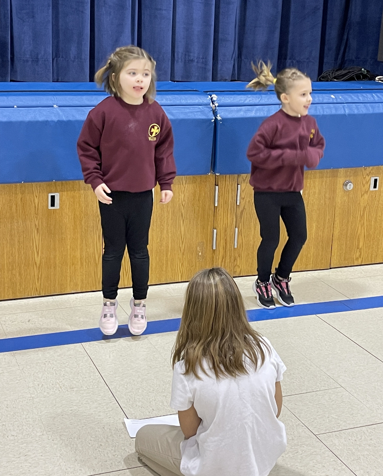 Each student collected five donations for MDA then hopped for two minutes in the gym. Fourth grade students assisted counting how many hops the Kindergarten students could do in that two minute time period.
