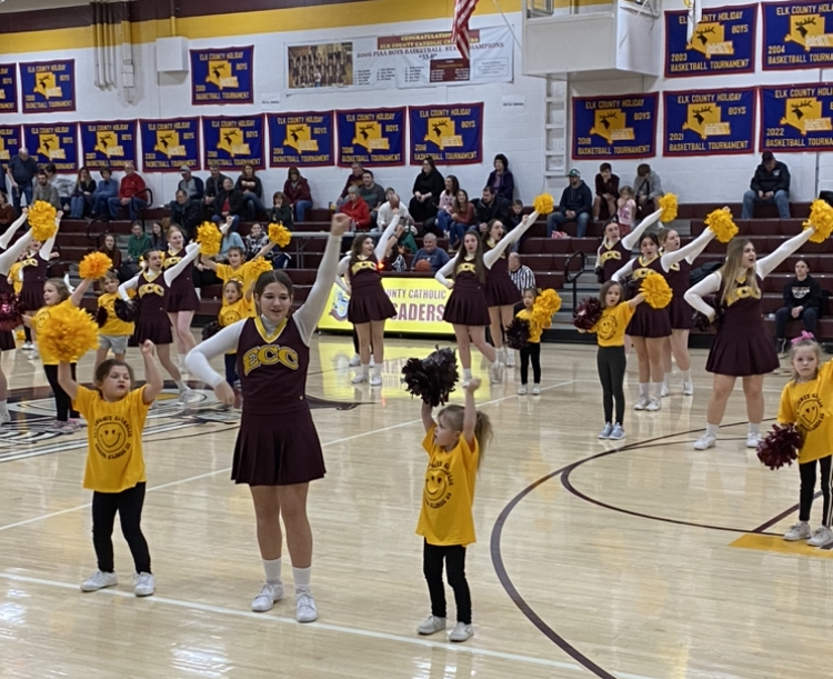 The ECCHS Winter Cheer Clinic was held for girls in grades K-5 interested in developing cheerleading skills. Instruction included bench cheers, floor cheers, stunting, jumps, and dance. After 2 days of the clinic, the little cheerleaders cheered a JV game along with the Varsity cheerleaders. A total of 35 participated in this winter’s cheer clinic.