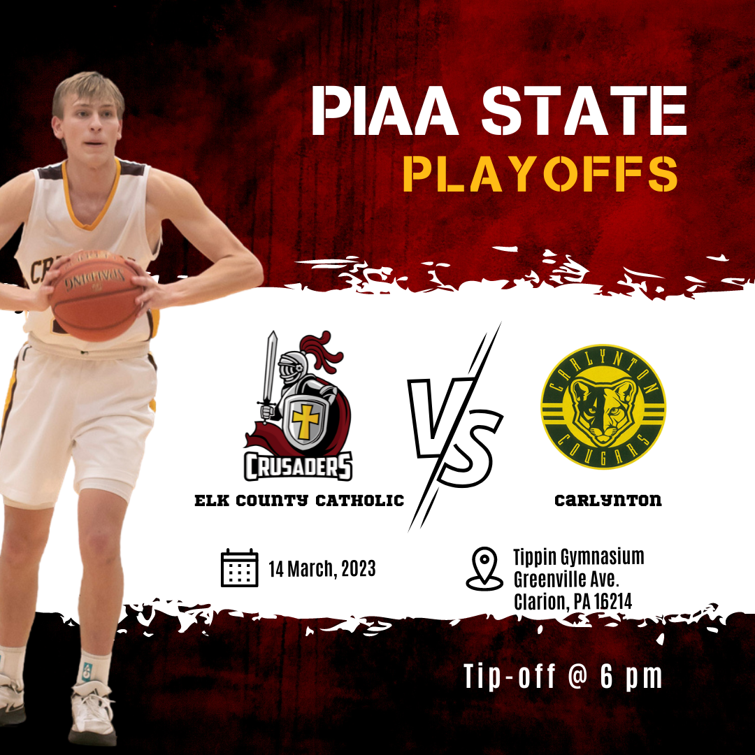 The Crusader Boys Basketball team face Carlynton this evening, Tuesday March 14th at 6 pm at PennWest Clarion University in the second round of the PIAA 1A State Playoffs.