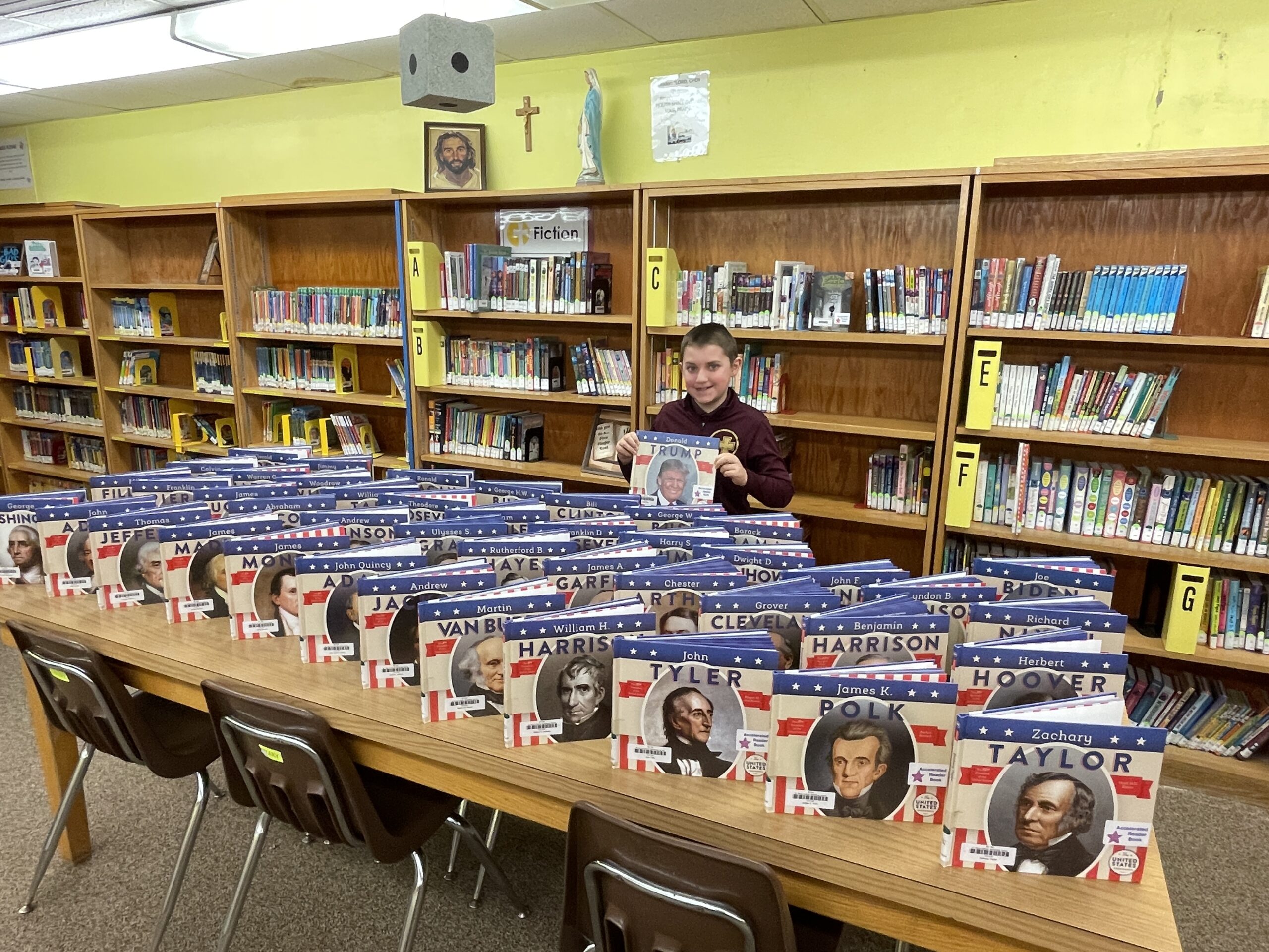 Charlie Warmbrodt, a 4th grader at St. Marys Catholic Elementary School completed quite an accomplishment. Starting in 3rd Grade Charlie challenged himself to read a president series available in the elementary school library. Charlie completed the Accelerated Reading test after reading the President’s series in order. Since the 46th President book was just recently published it doesn’t have an AR test created yet. Charlie is hoping the AR test will come out soon so that he can fully complete the AR test goal. Pictured is Charlie in front of the President series. Mrs. Wittman, SMCES’s Library and Computer Science teacher, hopes Charlie inspires others to take up their own challenge.