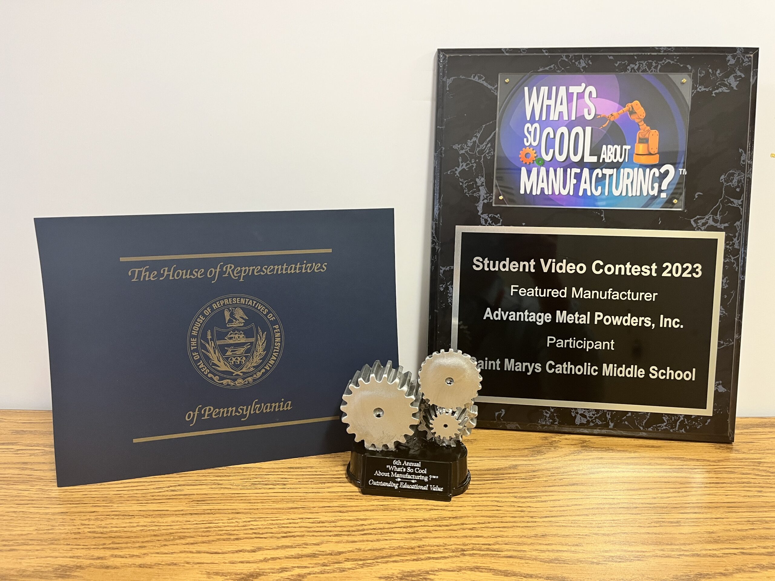 The team from Saint Marys Catholic Middle School won the award for the video with the Best Educational Value. The team from SMCMS teamed up with Advantage Metal Powders for their video.