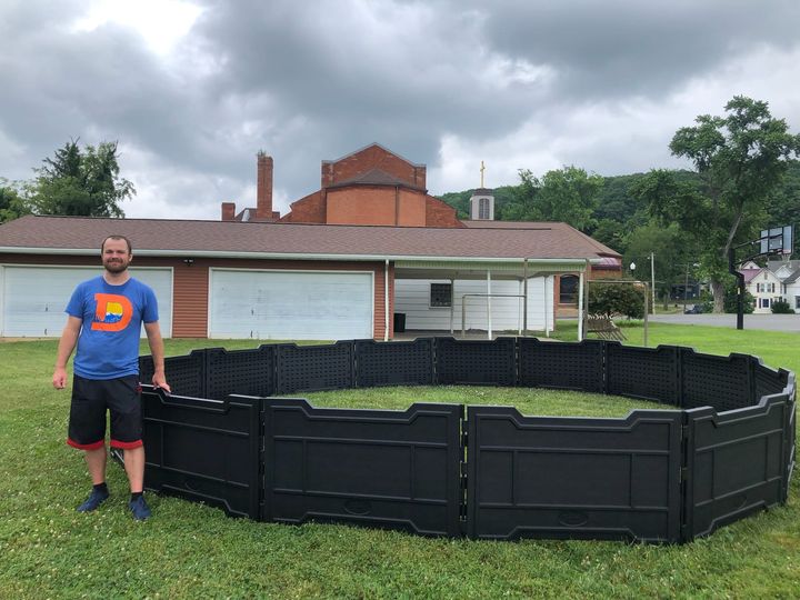 Children were able to try out the new pit at last week’s Knights of Columbus movie night. Pictured is St. Leo School’s PE and Technology teacher Mr. Jeff Slattery. He explains Gaga ball is like dodgeball but in an enclosed area.