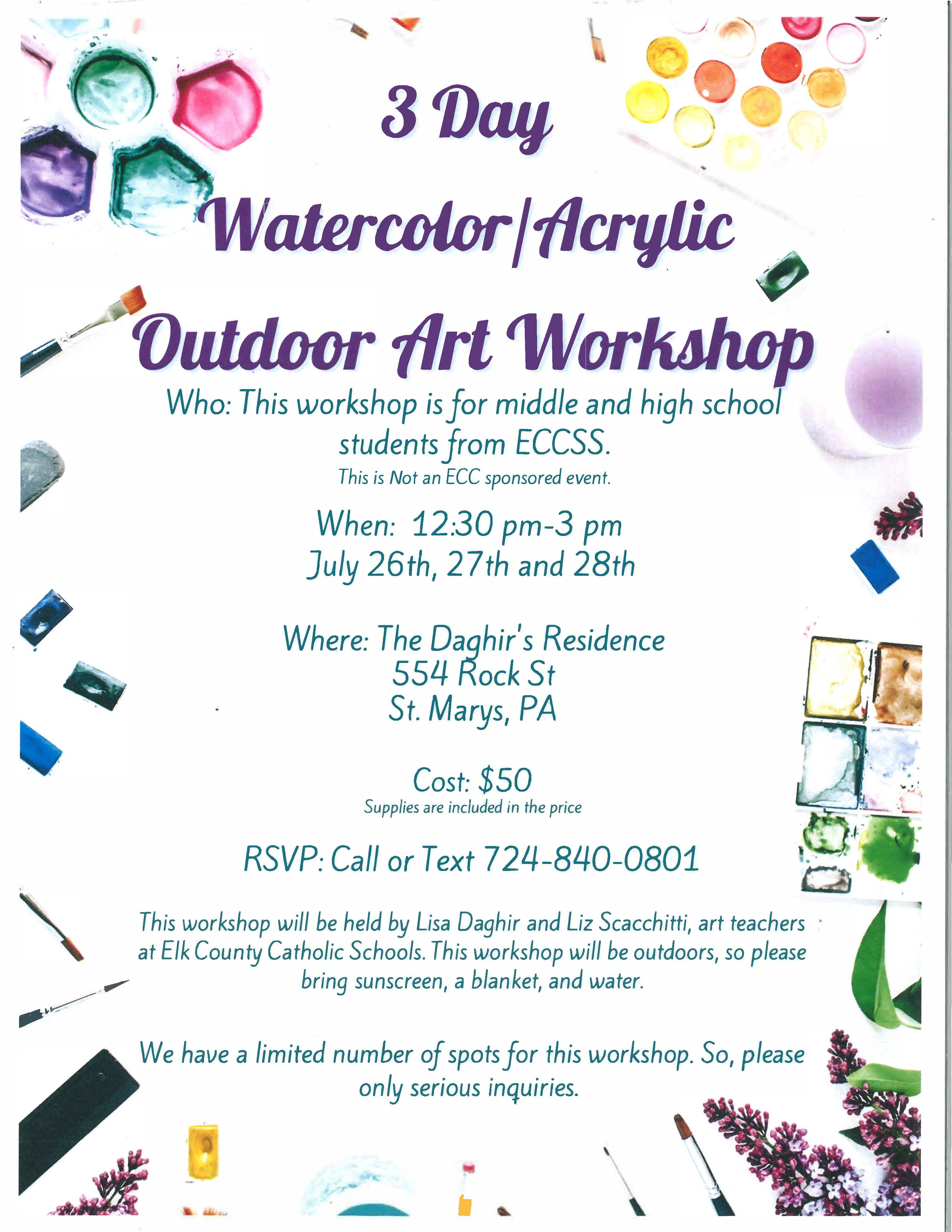 Reminder the Outdoor Art Workshop hosted by ECC art teachers Lisa Daghir and Liz Scacchitti will be held tomorrow, July 26th-28th from 12:30-3 pm at 554 Rock Street in St. Marys.