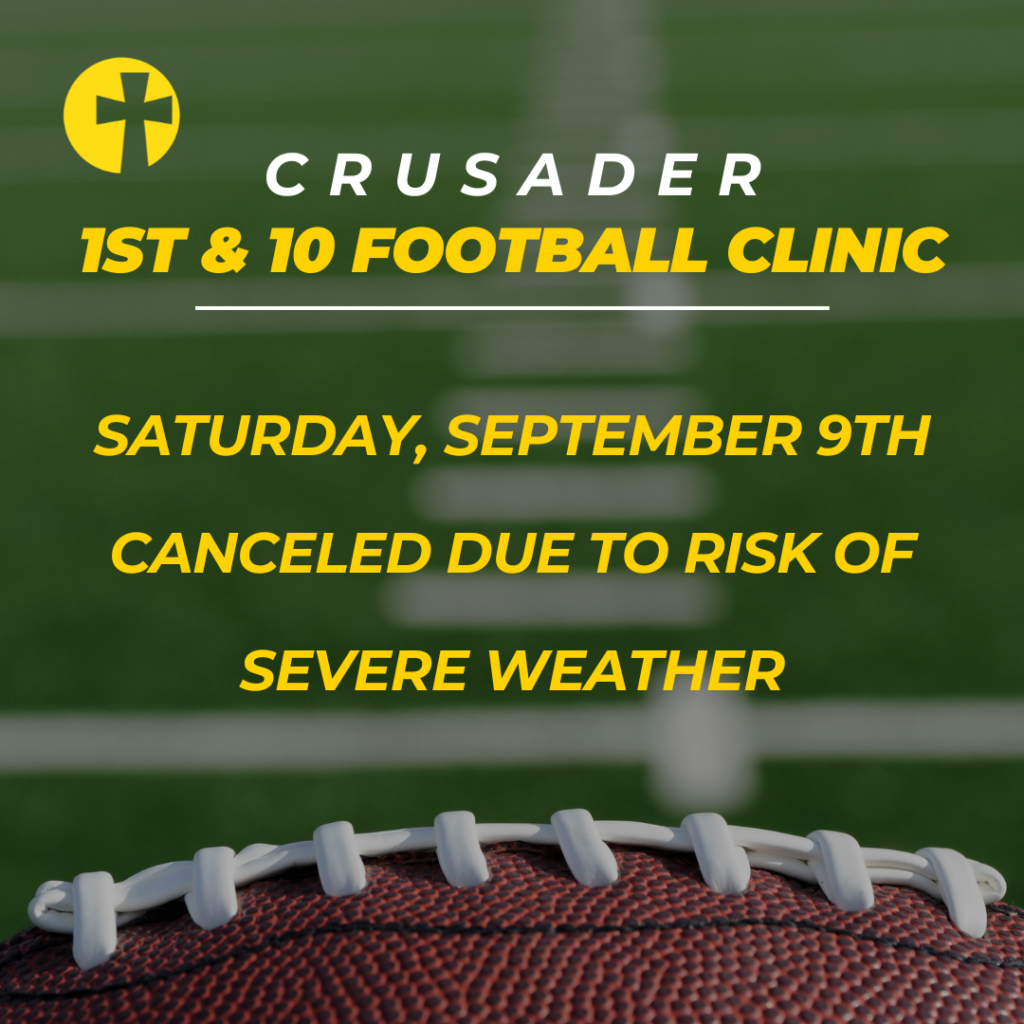 The Crusader 1st & 10 Football Clinic scheduled for today, Saturday, September 9th, has been canceled due to the risk of severe weather this morning. The next session will be held on Tuesday, September 12th, from 6-7 pm.