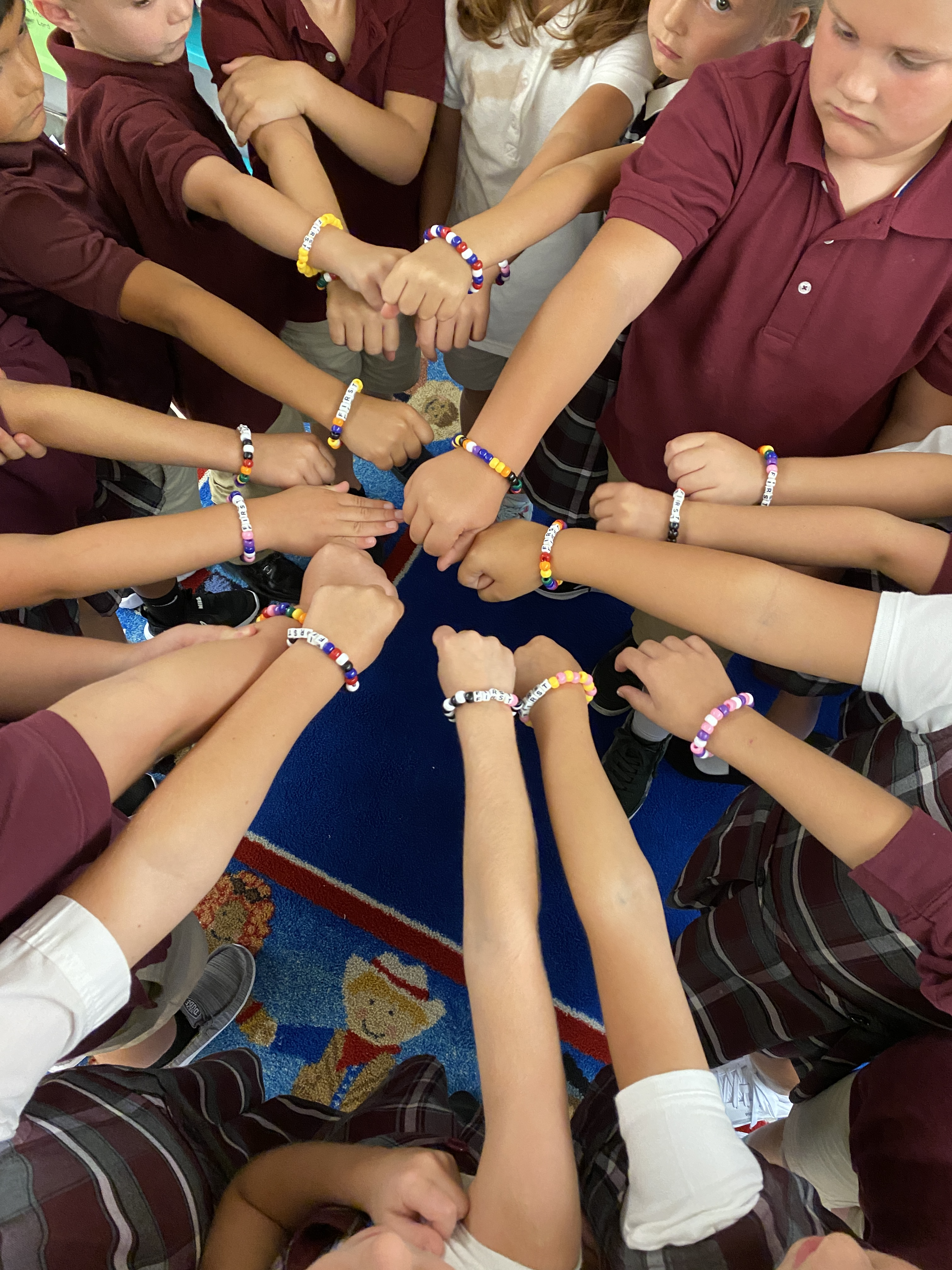 First-graders at St. Marys Catholic Elementary School listened to the story, Our Class is a Family and made bracelets demonstrating classroom camaraderie while getting to know their new class family.