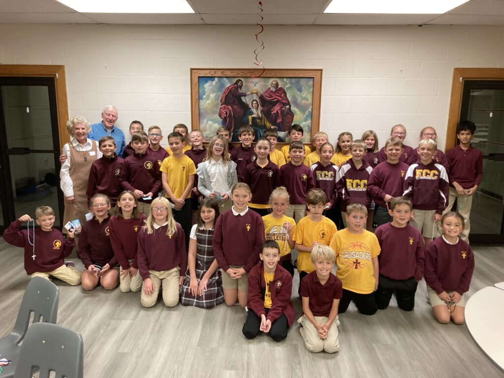 John and Margie Walsh of Erie began teaching the rosary to students in Catholic schools in the city of Erie through the Erie Diocese Rosaries for Kids Project. They have been traveling to all 13 counties of the diocese for 33 years. They bring some of the 1,000 colorful rosaries handmade by women of the World Apostolate of Fatima and blessed by Bishop Lawrence Persico for distribution. Margie uses puppets, statues, a crucifix, coloring books, and many handwritten materials to make her hour-long talks come alive. The Walsh’s and fourth-grade students from St. Mary’s Catholic Elementary School are shown in the picture.