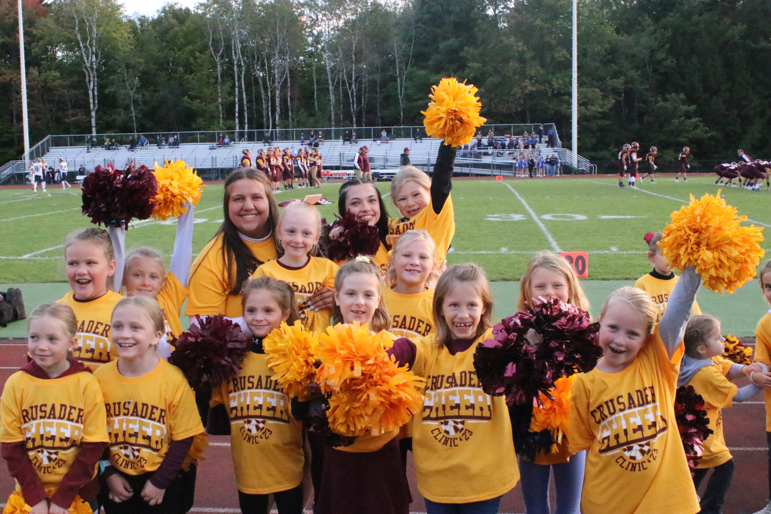 The cheer clinic participants got to cheer with the Varsity squad on September 22nd at the ECC vs. Otto Eldred football game while the 1st & 10 participants lined up to cheer on the Crusaders as they took the field.