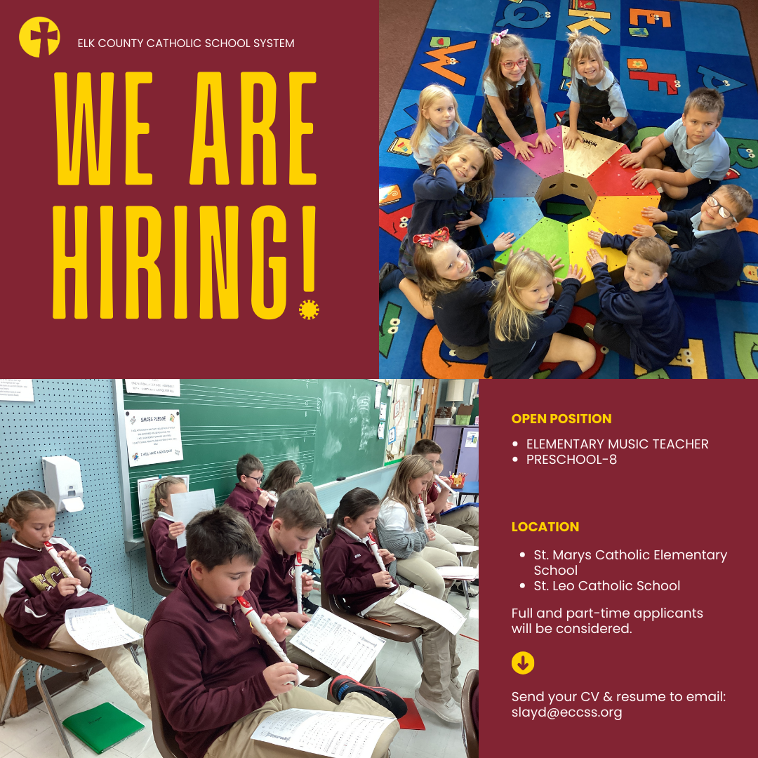 Elk County Catholic School System has an anticipated vacancy for a permanent Elementary Music Teacher at the St. Marys Catholic Elementary and St. Leo campuses. Applications for both full-time and part-time candidates will be accepted.