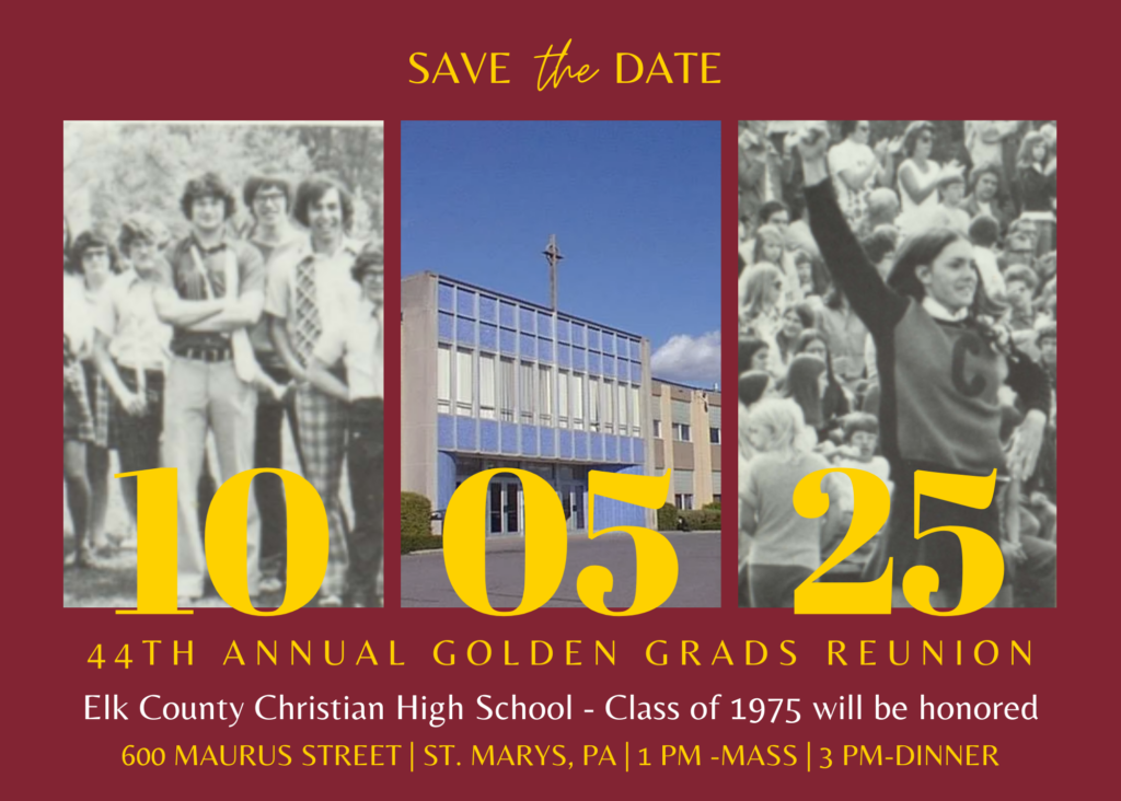 The 44th Annual ECCHS Golden Grads Reunion will be held on Sunday, October 5, at Elk County Catholic High School. We look forward to a day of fun and fellowship as we honor the class of 1975!