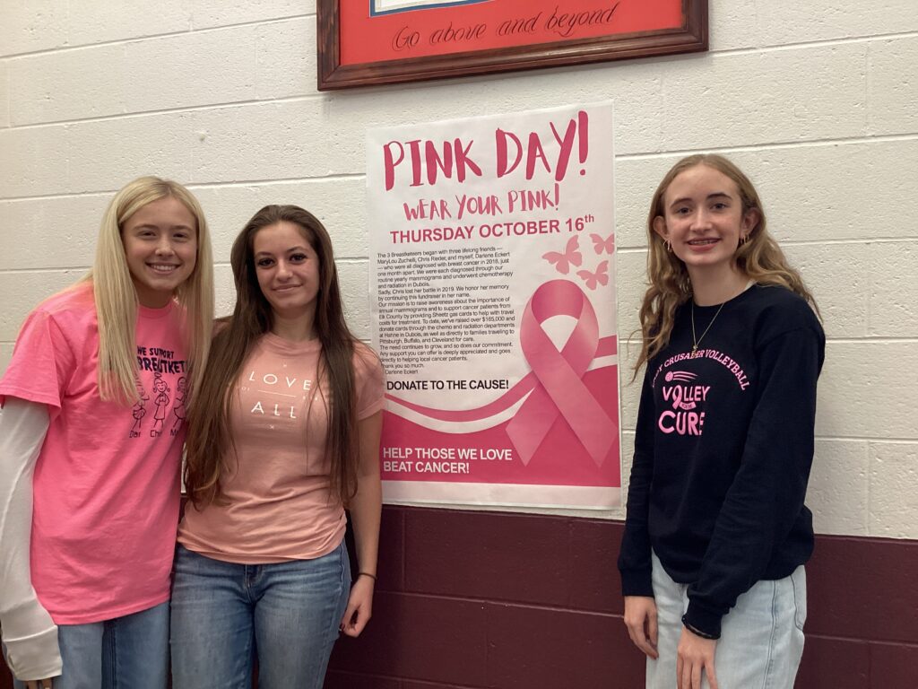 Students at St. Mary’s Catholic Middle School and Elk County Catholic High School held a Pink Day to help raise money for the 3 Breastketeers, whose mission is to raise awareness about early detection and support cancer patients’ travel costs.
