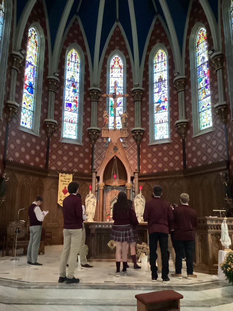 This complements the juniors’ course of study for the year, The Sacraments. They spent time studying and reflecting on the images. Journal prompts allowed them to contemplate the lessons contained in the glass, as well as to appreciate their artistry and the beautiful architecture of the Church.