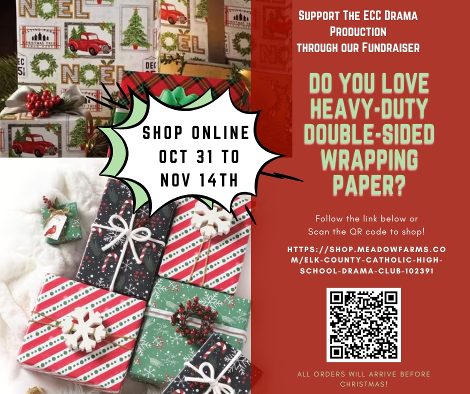 Help support ECC’s Drama Club! They are selling wrapping paper, candles, and other holiday items to help raise funds to cover the cost of supplies, props, and costumes for their next production. Orders ship directly to your home! Visit https://shop.meadowfarms.com/elk-county-catholic-high-school-drama-club-102391.