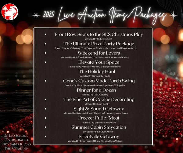 There are still a limited number of tickets available for this Saturday’s St. Leo School Reverse Raffle! Tickets are $80 and include admission for two, dinner, and a chance at the $1,500 Reverse Raffle Grand Prize! Join us for a night of great food, prizes, and entertainment. For tickets, contact Sara Anderson at 814-389-5775.