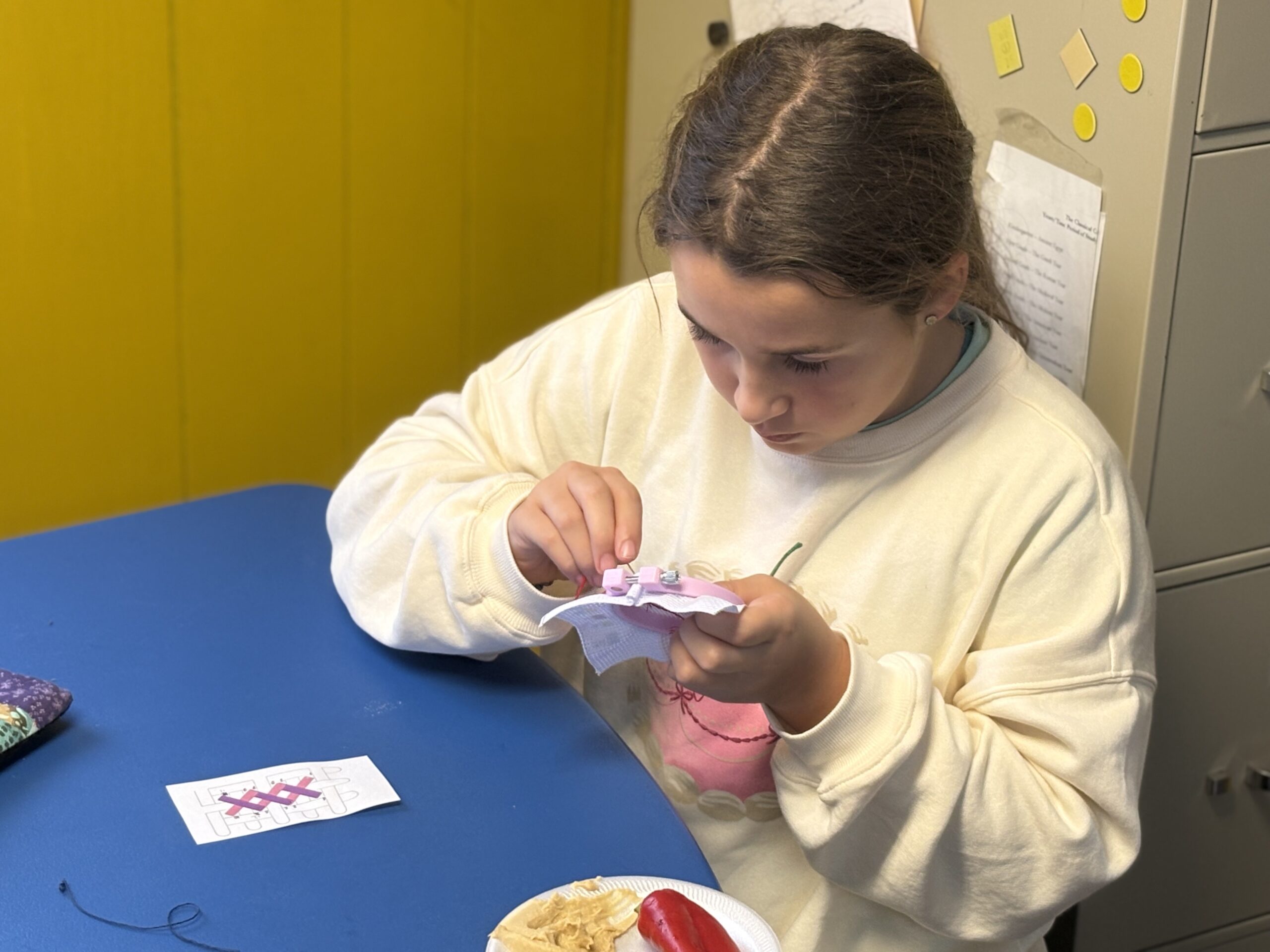 The You Go Girl! club at St. Leo School is keeping up with the classical traditions. This week, special guest SLS Principal Mrs. Lynne Kucenski joined the club to teach cross-stitching.
