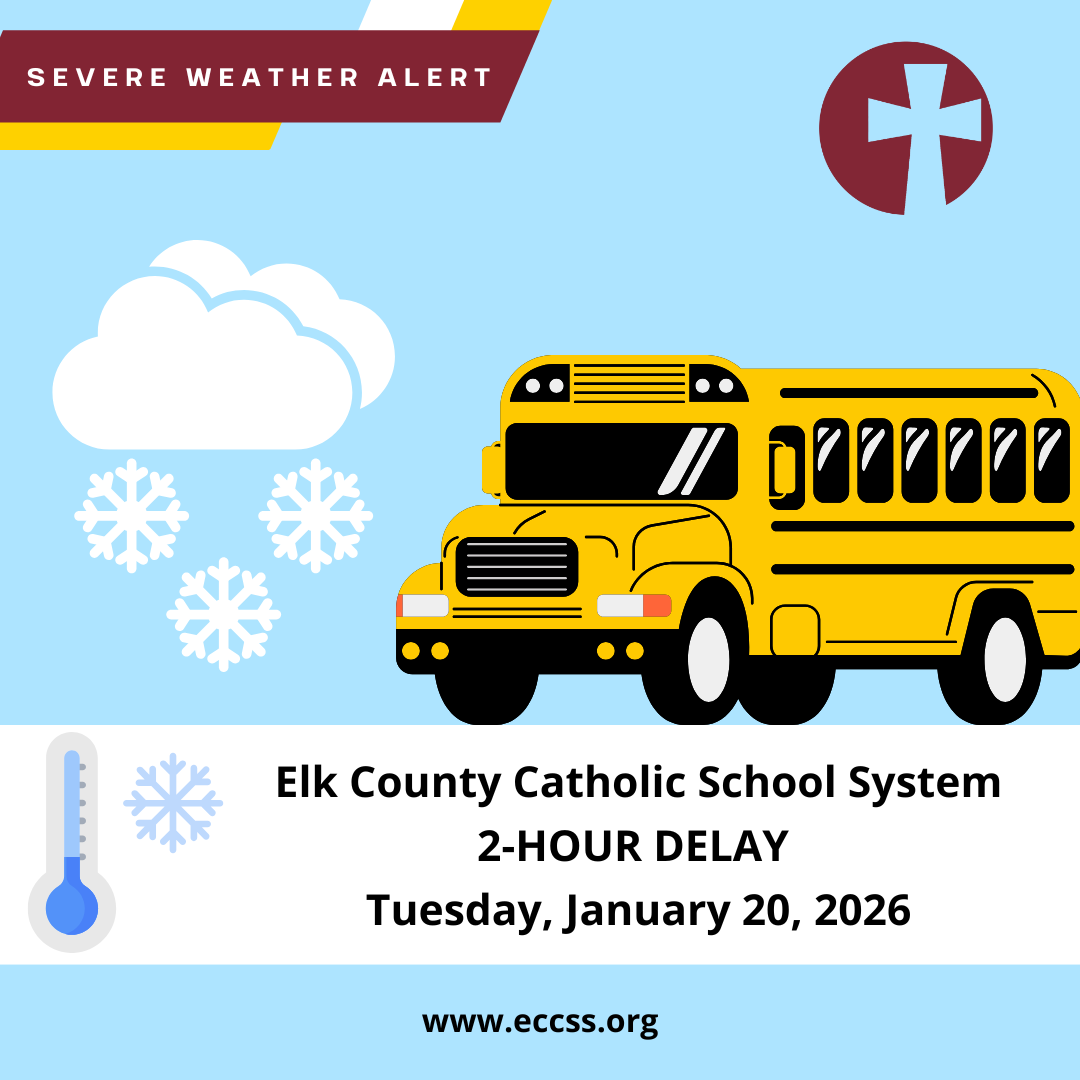 Due to the forecasted wind chill temperatures, Elk County Catholic School System Schools will be on a TWO-HOUR DELAY on Tuesday, January 20. This includes Saint Marys Catholic Elementary, Saint Marys Catholic Middle School, Elk County Catholic High School, and St. Leo Catholic School in Ridgway. Stay warm!