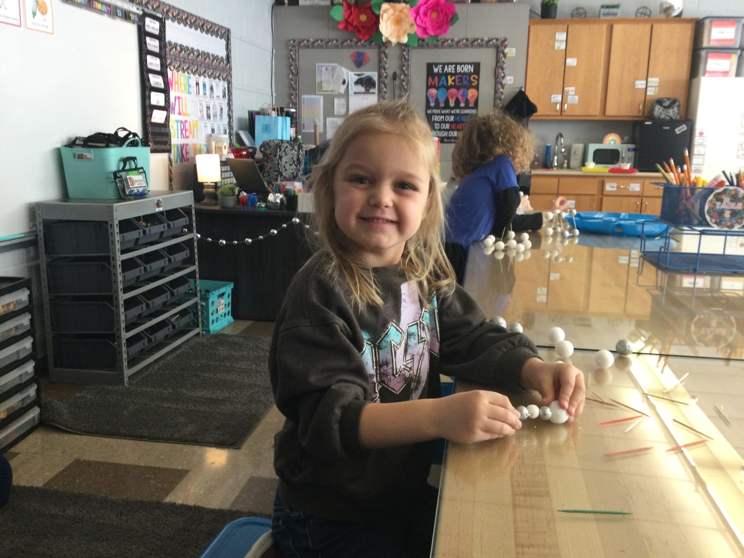 Preschool is learning about snowflakes and solid shapes in Mrs. Ashley Puncheon’s STREAM class at St. Marys Catholic Elementary School. Students made cubes out of styrofoam balls and toothpicks. Stay tuned for our CSW LEGO project next week!