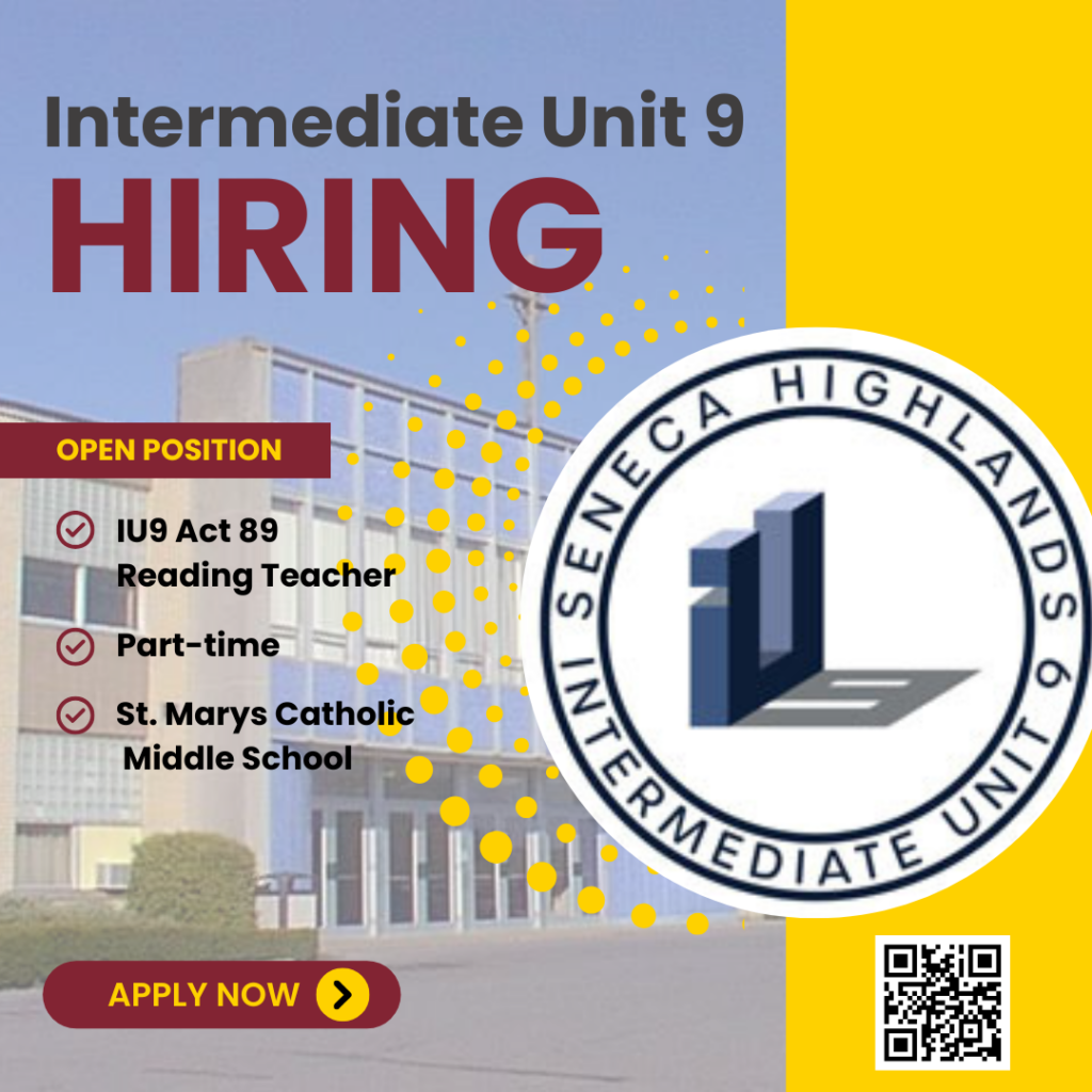 Intermediate Unit 9 has an opening for a Part-Time Act 89 Reading teacher at St. Marys Catholic Middle School.