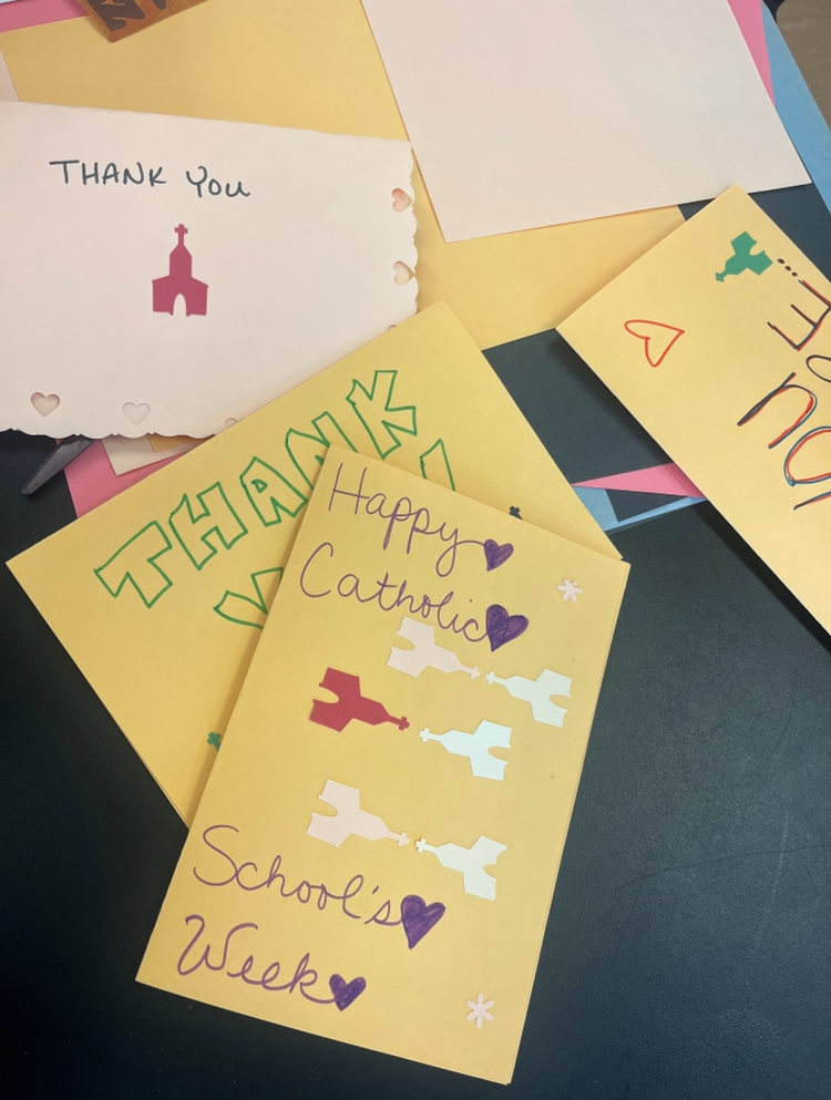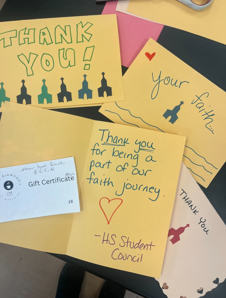 Thank you to our ECC Student Council for the handmade cards and our very own barista, Gerrianne Vogt, for The Diamond Perk drink coupon! Each card included a handwritten message from the students thanking staff for inspiring them in their Faith journey, and then was delivered to all our teachers, staff, cafeteria workers, secretaries, maintenance, and administration.