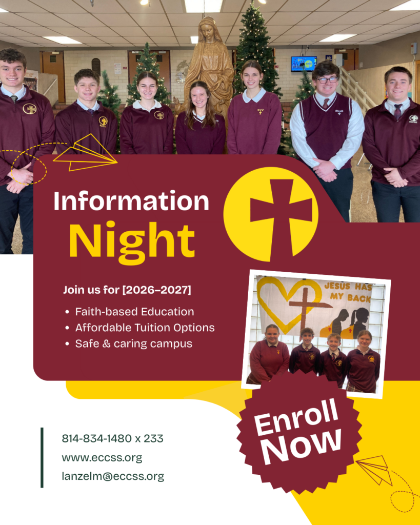Join us this evening, February 16, to discover what our Crusader family is all about! We’re hosting an Information Night for both St. Marys Catholic Middle School (starting at 6 p.m.) and Elk County Catholic High School (starting at 7 p.m.).