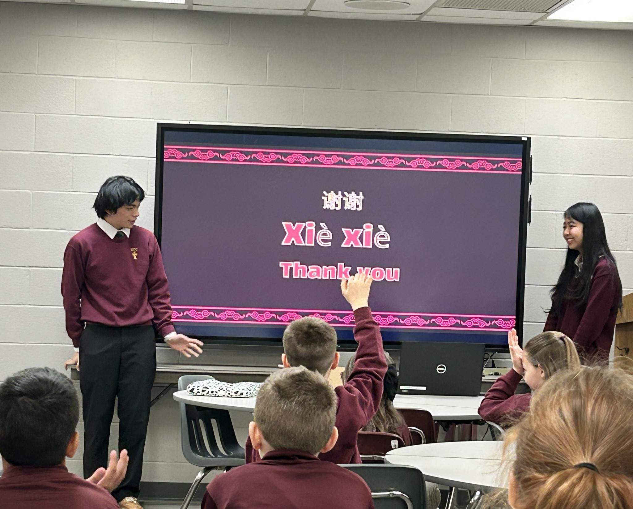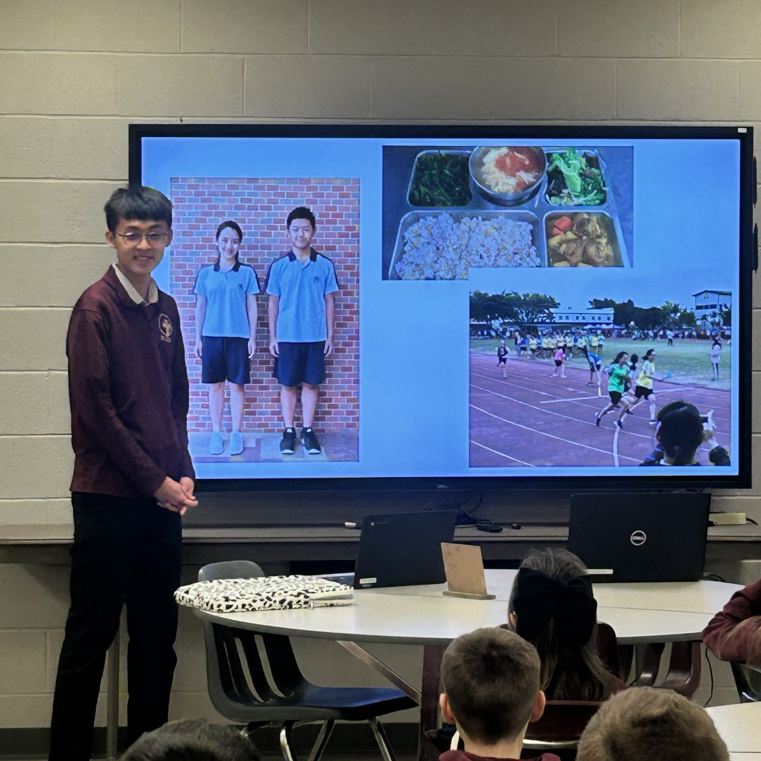 Mia Wang (China), Mavric Chen (Taiwan), and Haoran Zhu (China) each prepared engaging presentations to share about their home countries. They highlighted unique aspects of their cultures, explained differences between their countries and the United States, and gave students a glimpse into what their elementary school experiences were like.